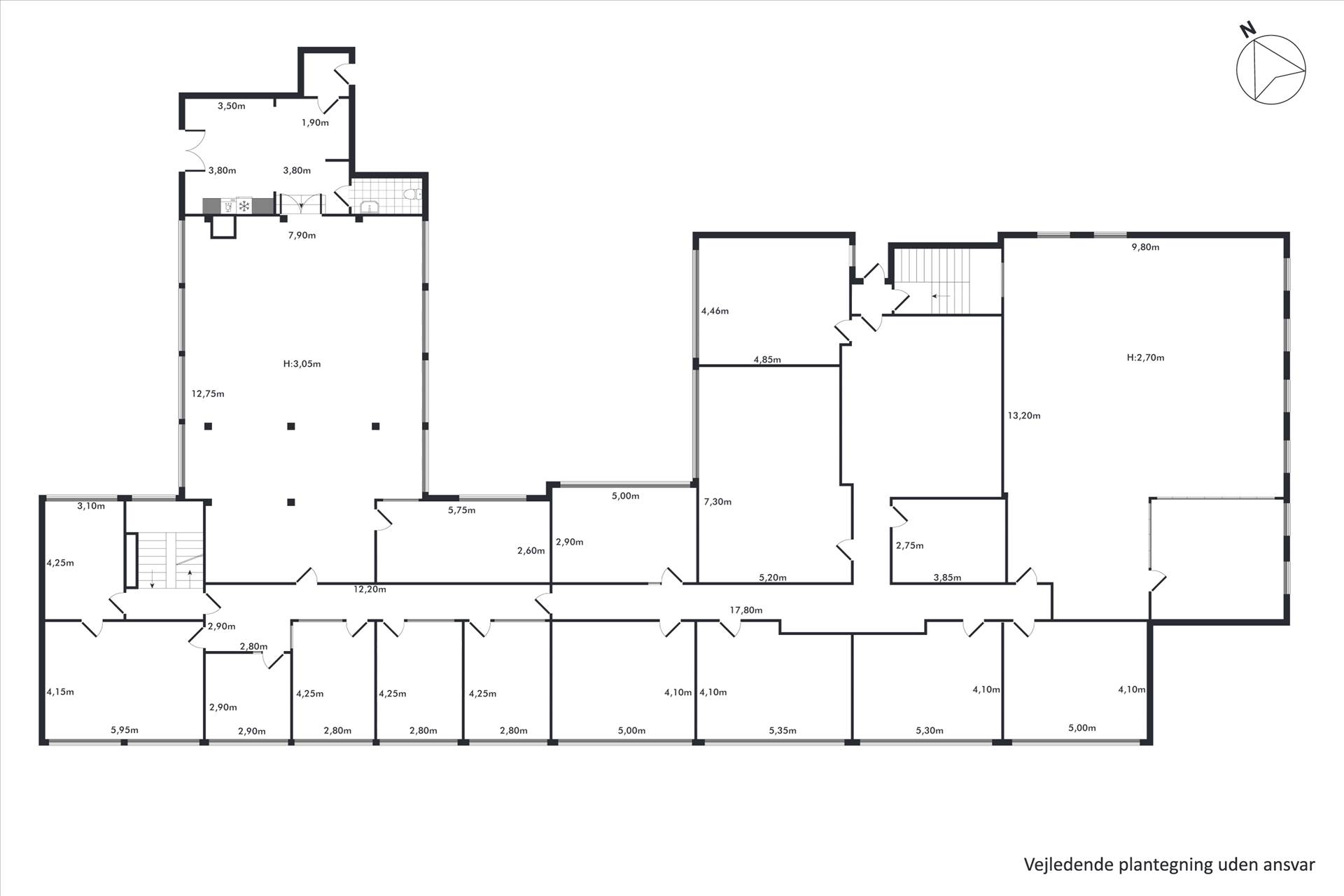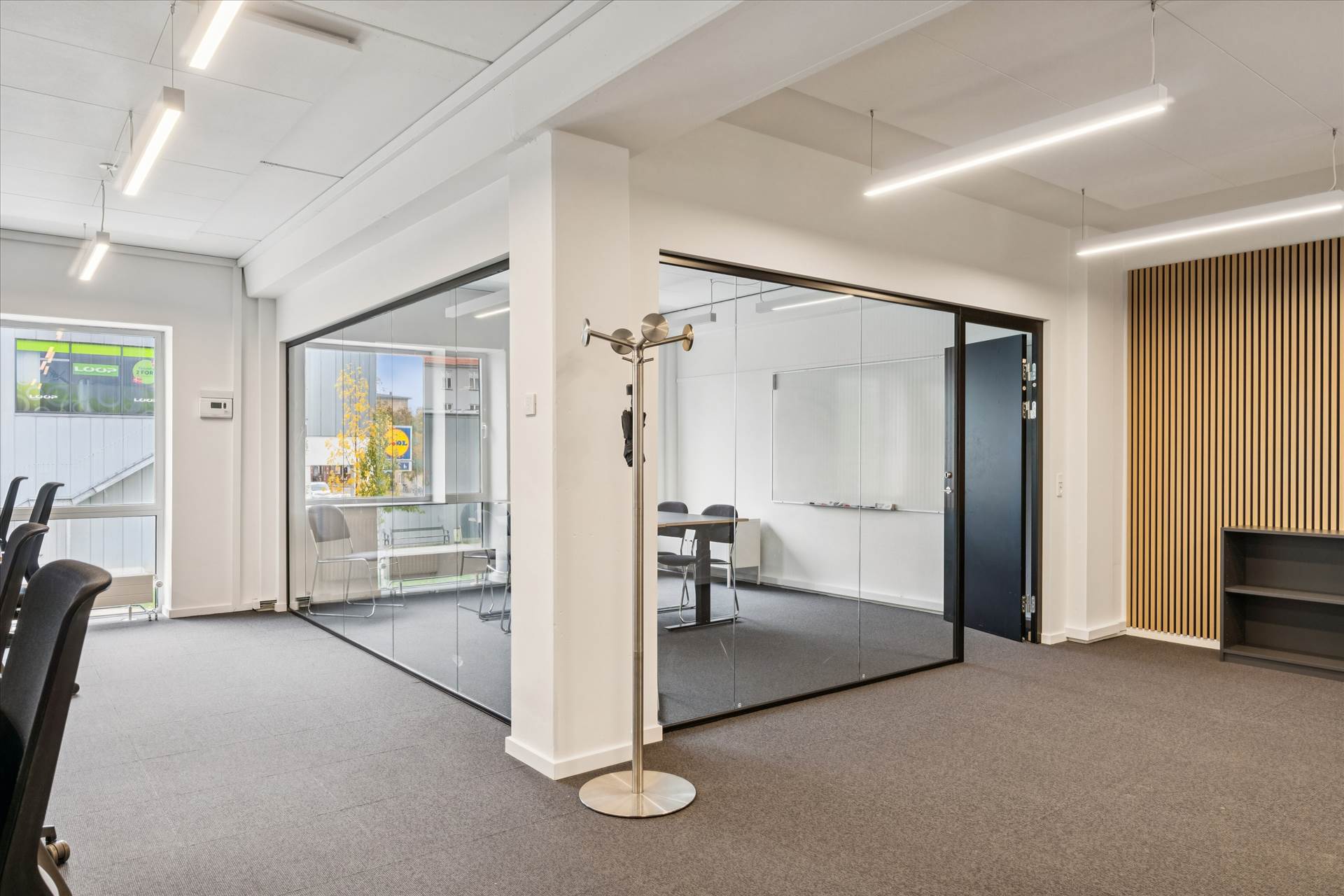 Lejemålet har adgang via pænt trapperum til 1. sal, og indeholder 13-14 mindre kontorer/møderum i varierende størrelse, lækkert storrum med plads til 20-25 arbejdspladser, kantine/stort mødelokale hvor udlejer sørger for at der etableres anretterkøkken efter aftale med den nye lejer. Endvidere 4 pæne toiletter samt et par gode arkiv-/printerrum. Et virkelig dejligt kontor, til en skarp pris, der kan rumme ca. 50 medarbejdere.