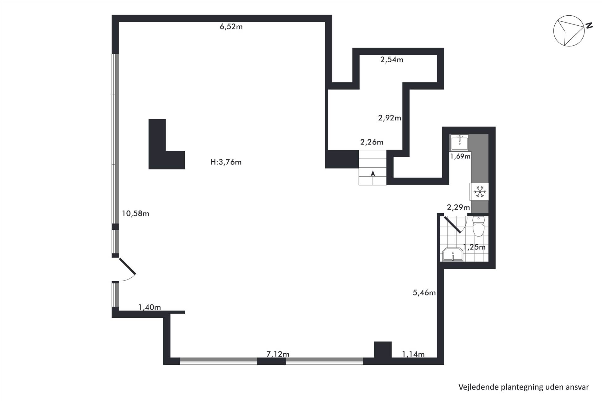 Lejemålet indeholder ét stort rum til salgsareal, lille baglokale, lille køkken samt et toilet. Salgsarealet er yderst regulært, og der kan udnyttes stort set hver en kvadratmeter til salgsareal.
