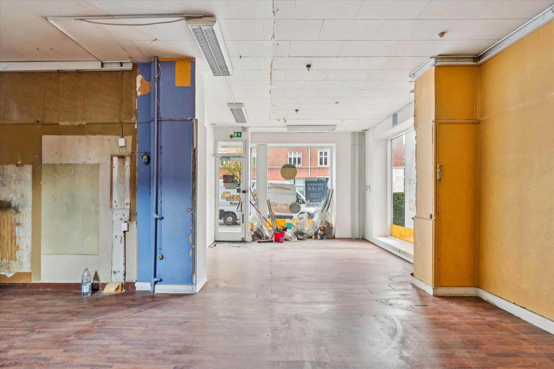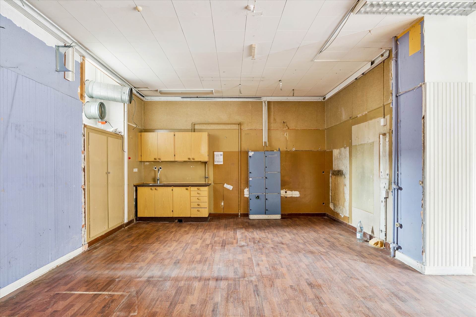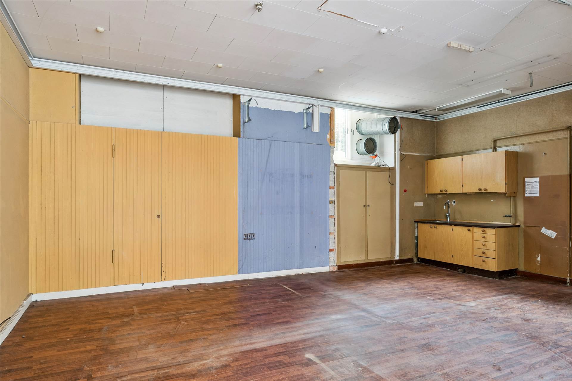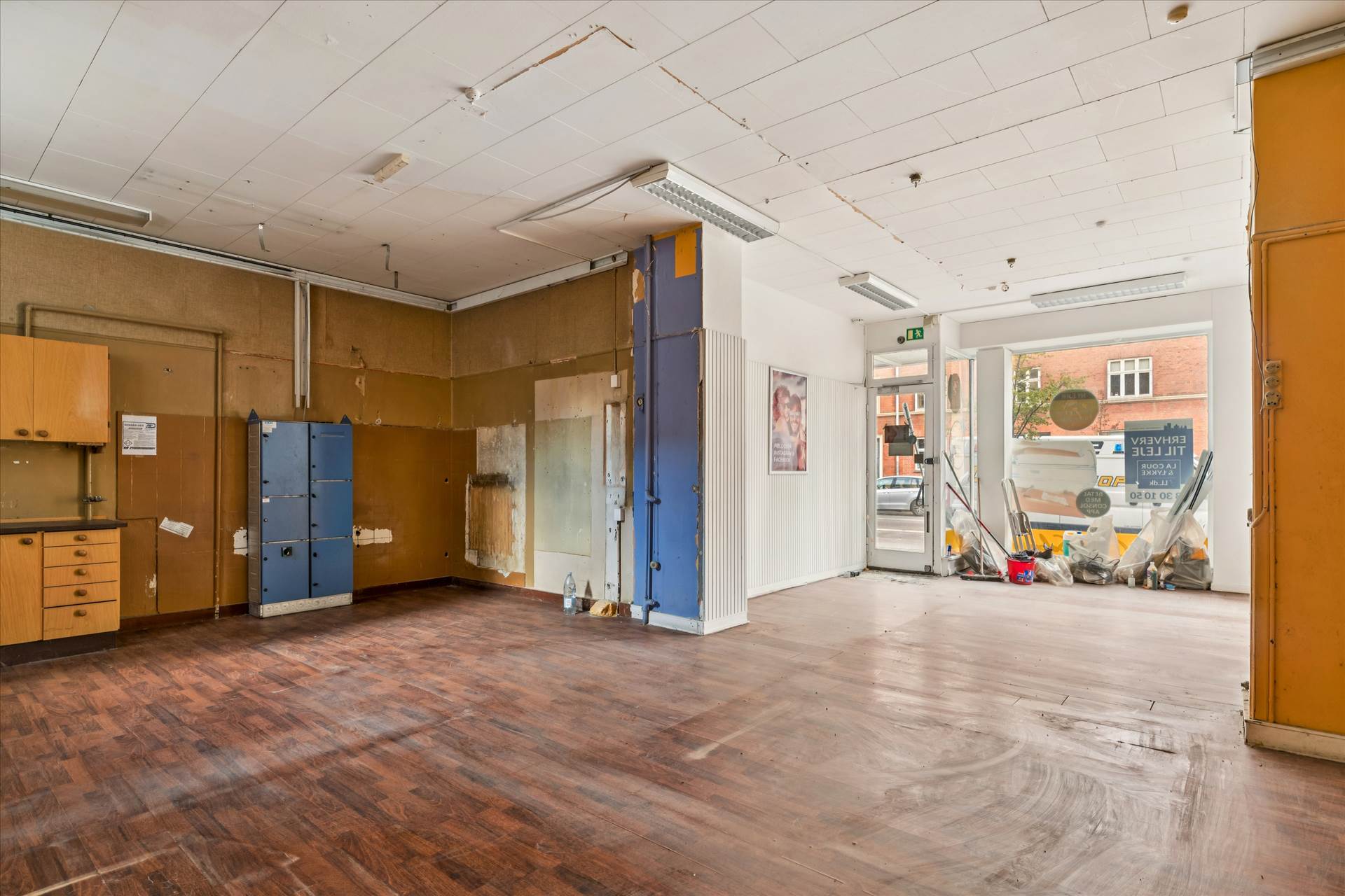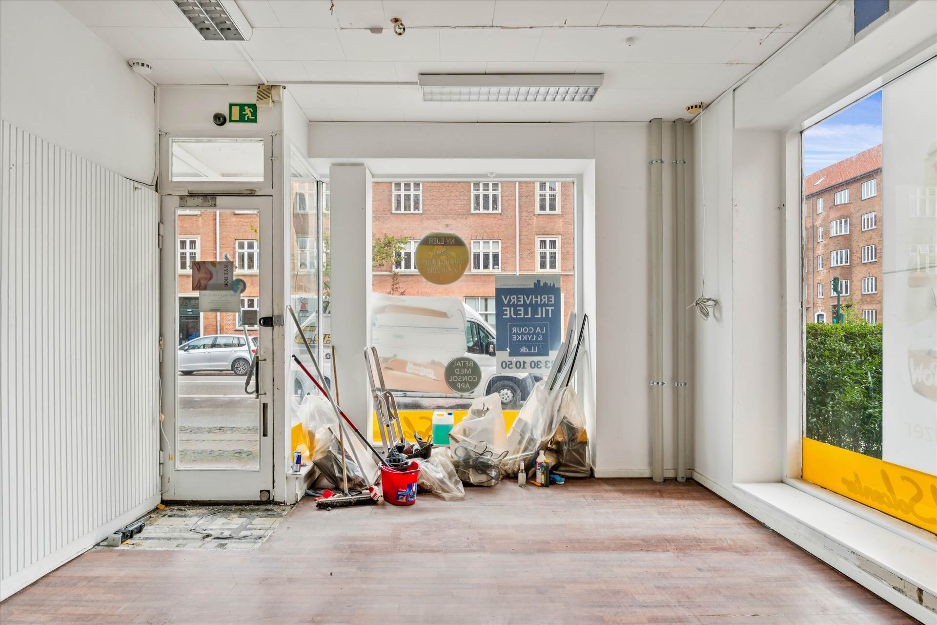 Indretningen består af et åbent lokale med trægulve, højt til loftet og et godt lysindfald fra de store vinduespartier. Bagtil findes et mindre personalerum med håndvask. Lejemålet fremstår i ældre stand og skal istandsættes, hvilket giver kommende lejer en oplagt mulighed for at skabe sit eget udtryk og tilpasse lokalet efter behov.