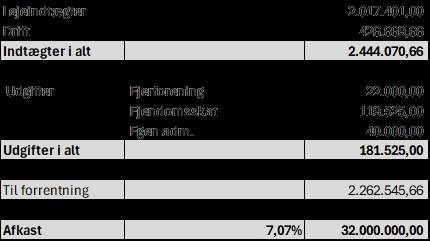 Erhvervsejerlejlighedens kontantpris på kr. 32.000.000, svarende til en gennemsnitlig forrentning på ca. 7,07 %. Den fulde udlejning og den brede lejersammensætning bidrager til en stabil og forudsigelig indtjening.