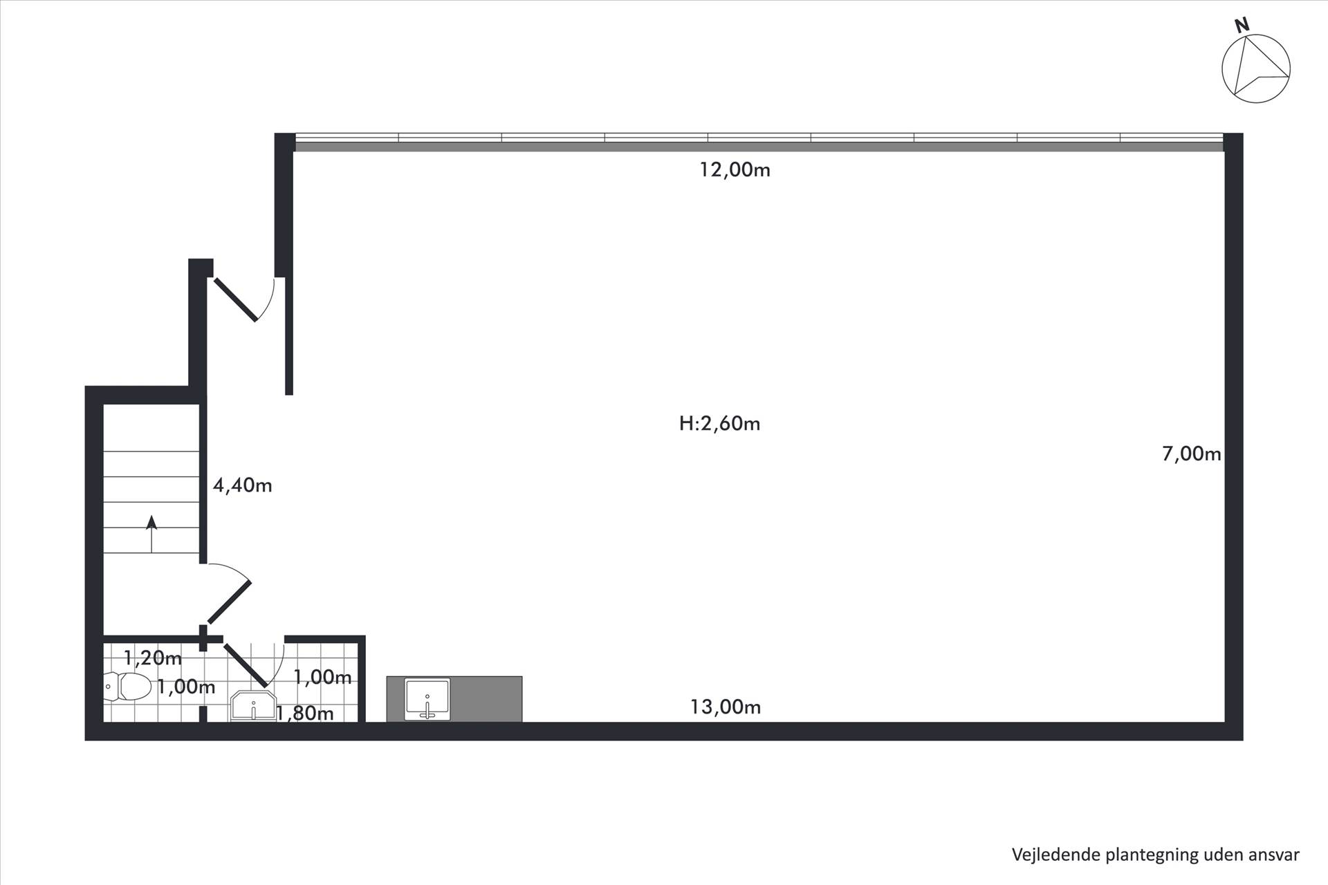 Lokalet fremstår lyst og åbent med store vinduespartier, rå murstensdetaljer og en loftshøjde på 2,6 meter. Rummet er stort, regulært og giver rig mulighed for både åbne arbejdsområder og indretning af mindre zoner efter behov. Derudover rummer lejemålet et lille tekøkken samt toilet- og badefaciliteter.
