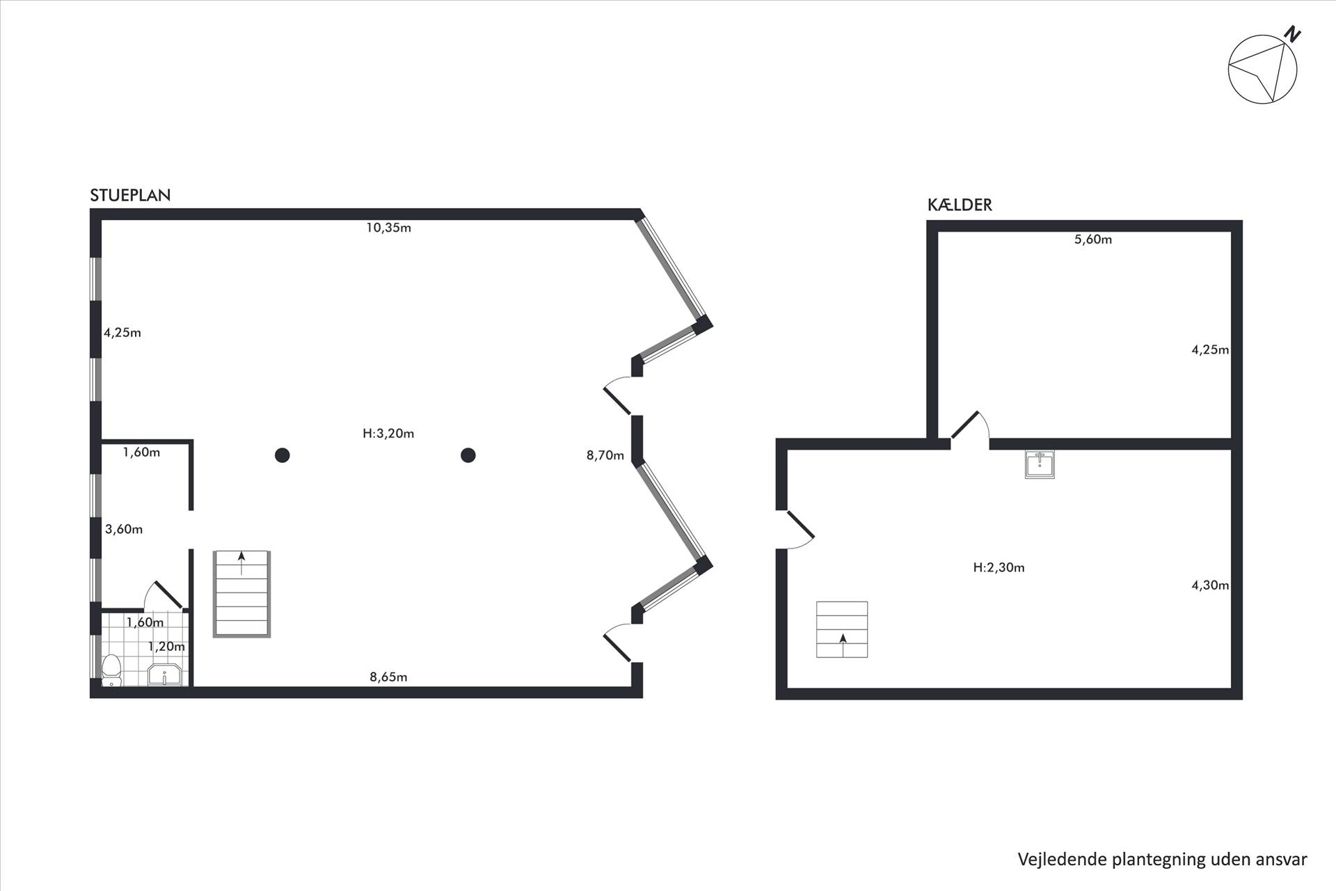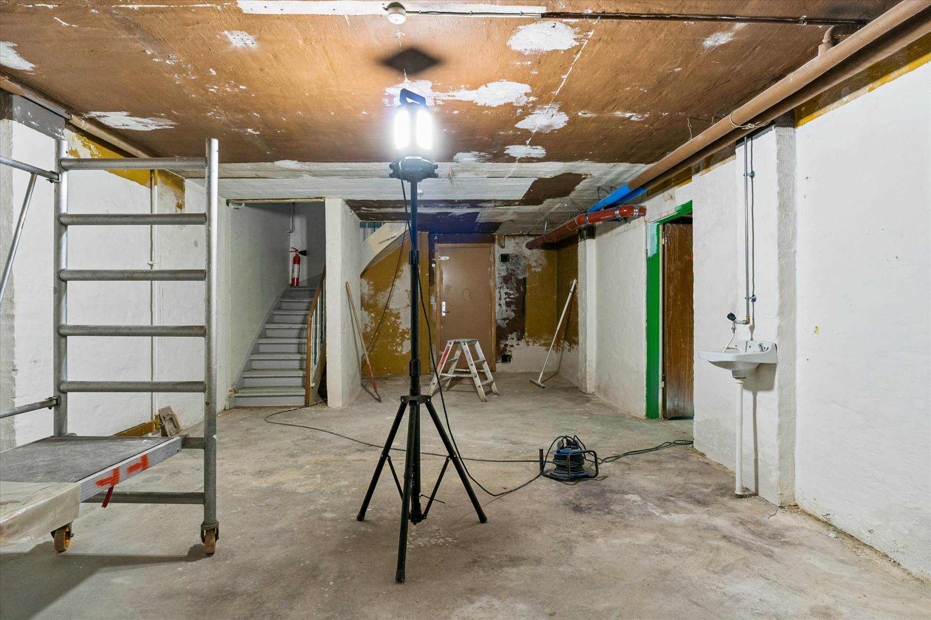 Stueplanens åbne arealer kombineret med den høje kælder giver gode muligheder for både præsentable kundeområder, arbejdspladser og lager eller personalefaciliteter.
