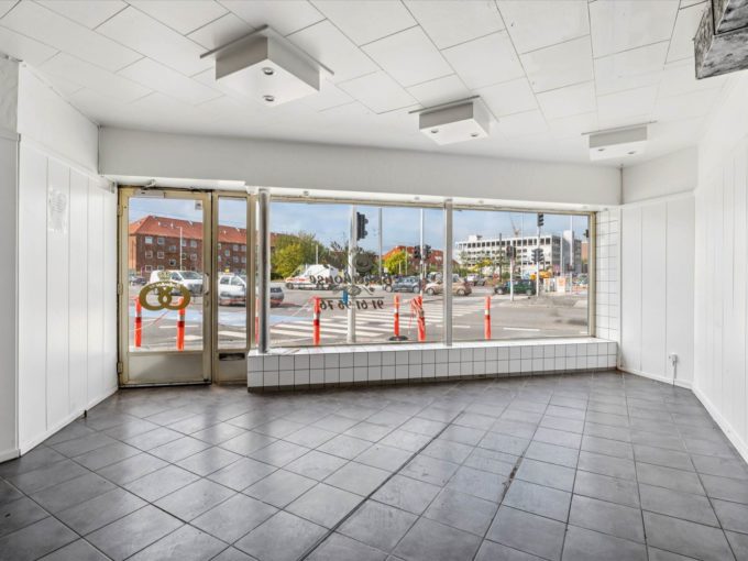 -Butikslokale: Stort, regulært rum med brede vinduespartier og direkte indgang fra gaden. Rummet har en loftshøjde på 2,74 m og fungerer som primært salgs- eller receptionsområde med god synlighed og naturligt lysindfald.