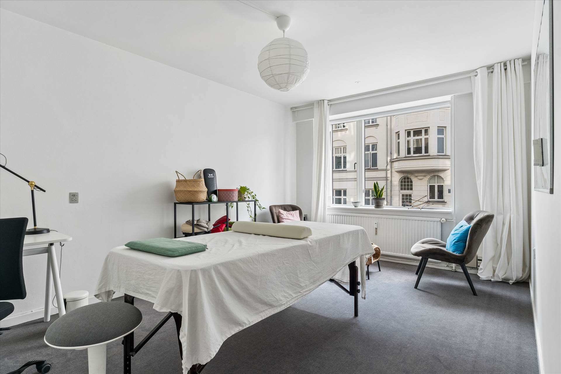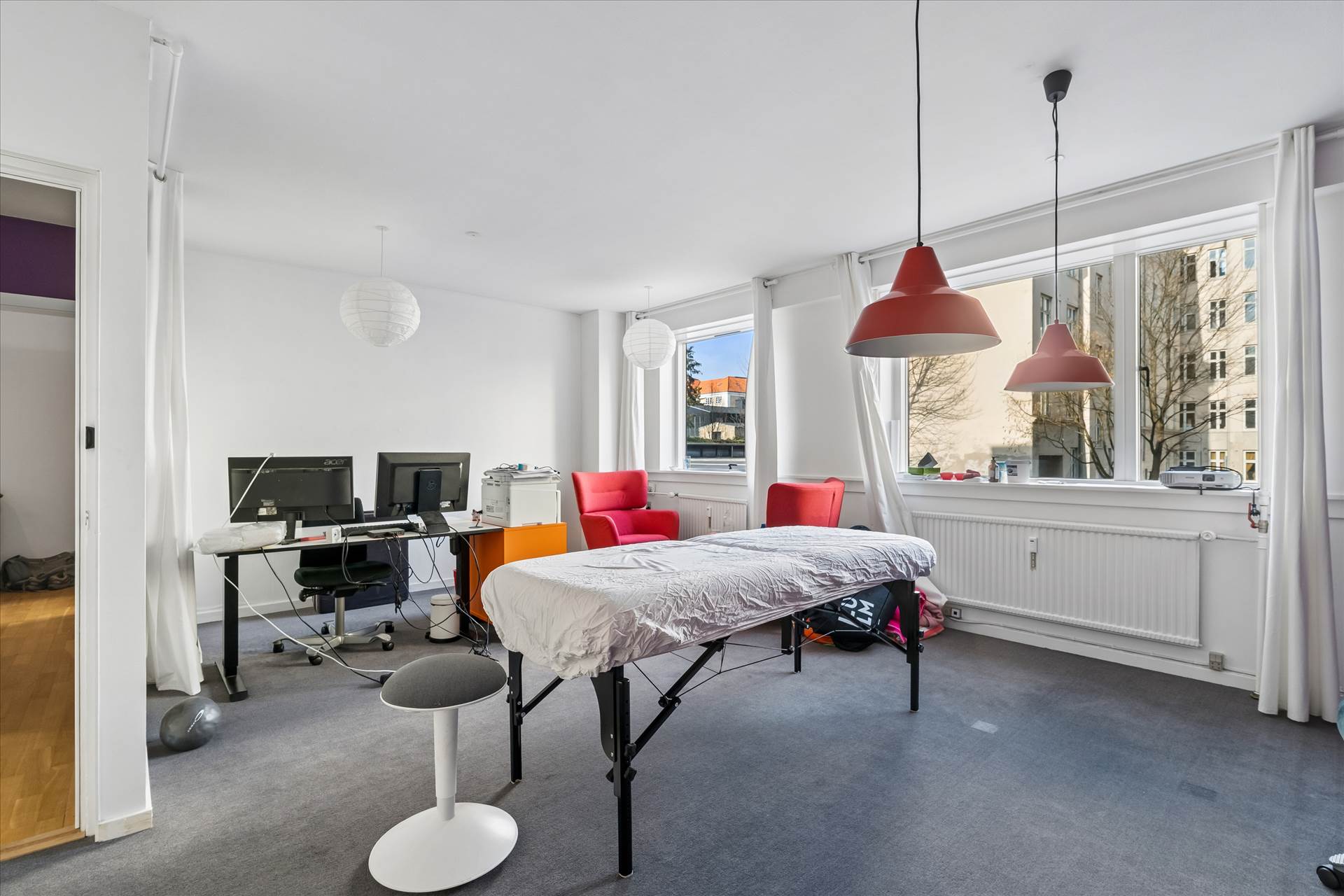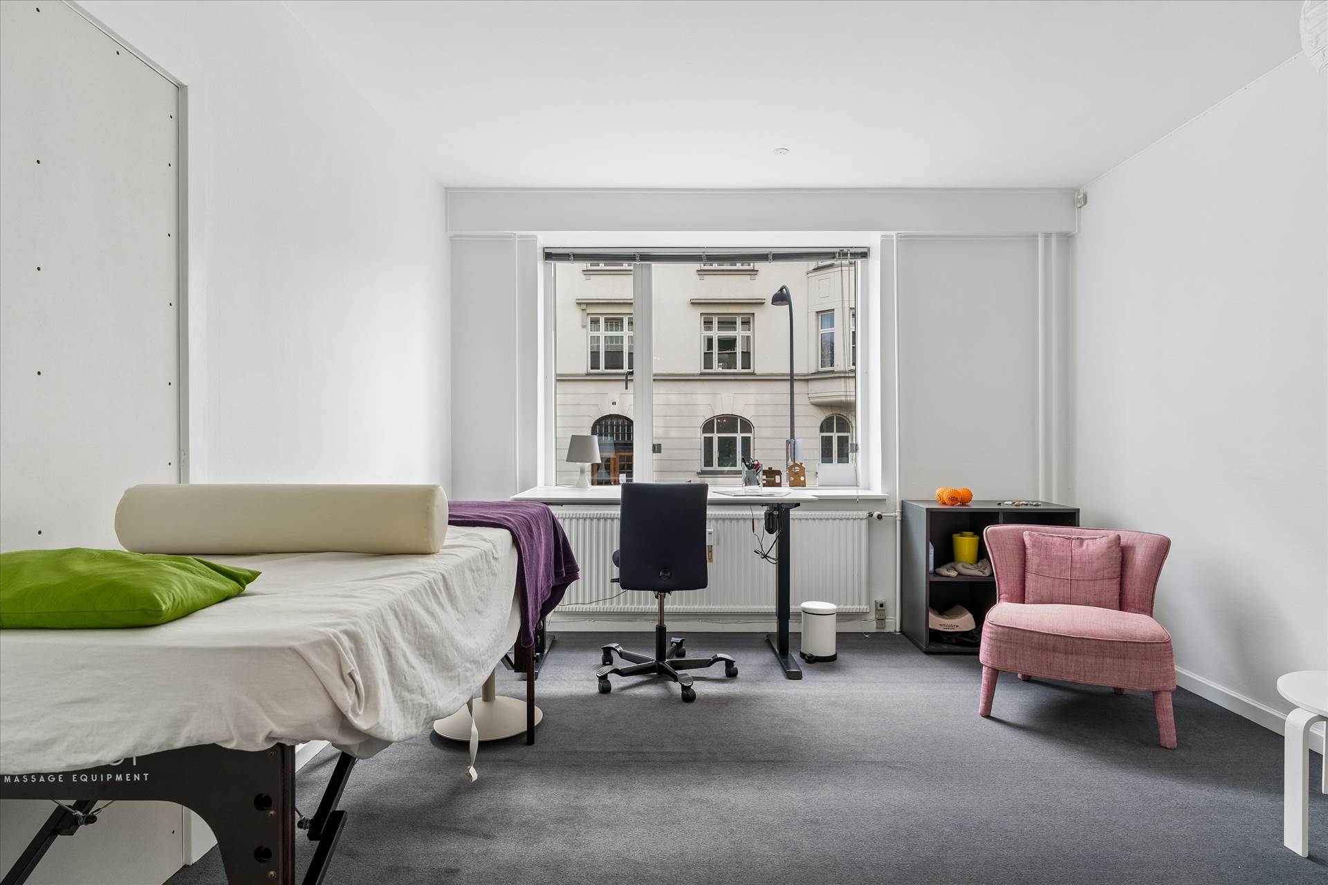 I stueetagen er der store vinduer, der sikrer rigeligt lys og et åbent miljø med flere kontorer/behandlerrum i varierende størrelser, et rummeligt køkken og toilet. Underetagen indeholder et stort lokale samt toilet og mindre depotrum. Direkte udgang til bagsiden af ejendommen med adgang til elevator, der giver nem transport mellem etager. Vinduer giver godt lys også i underetagen.
