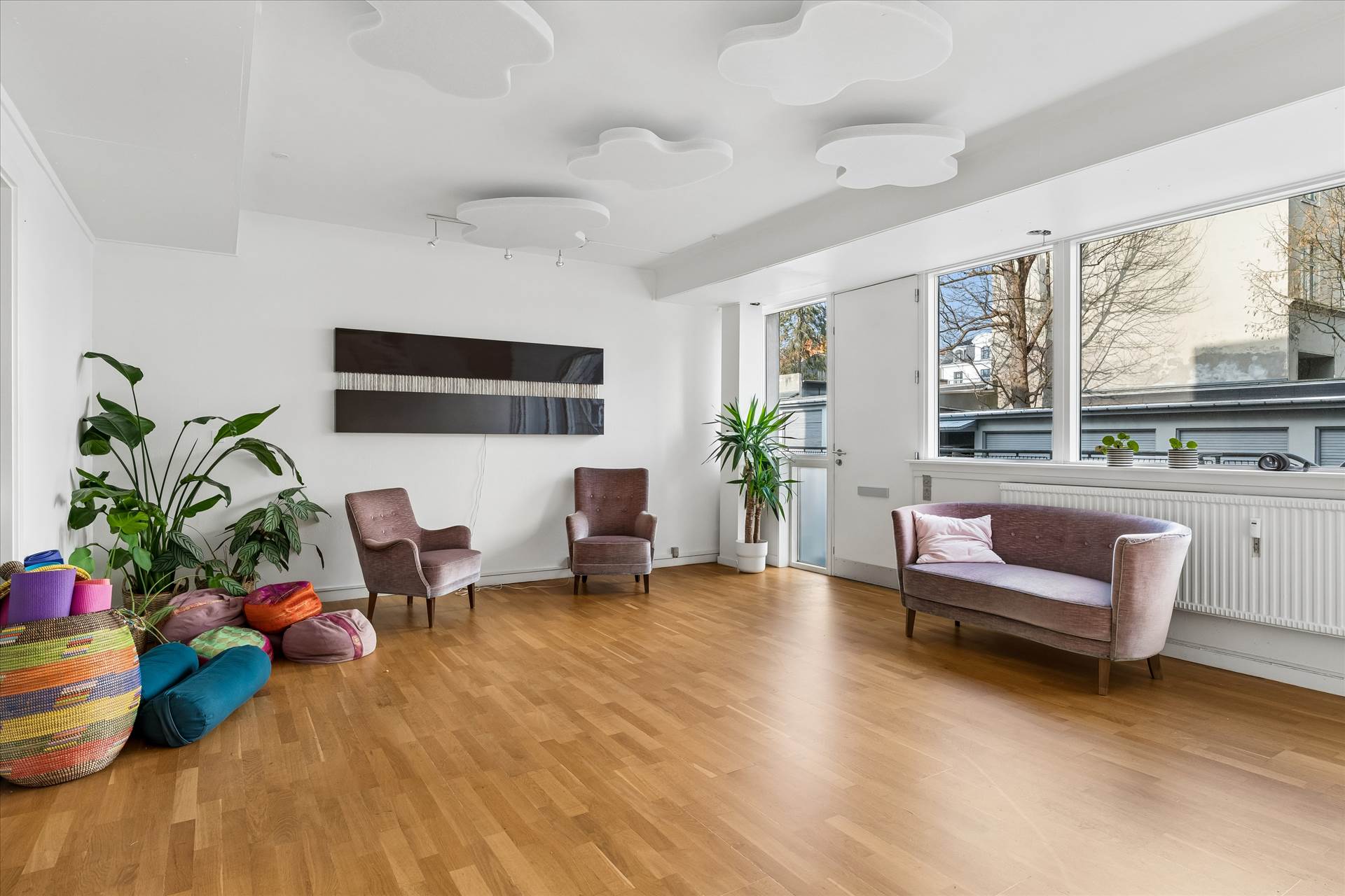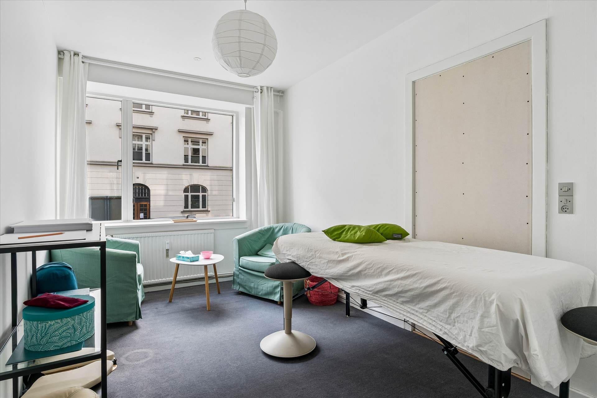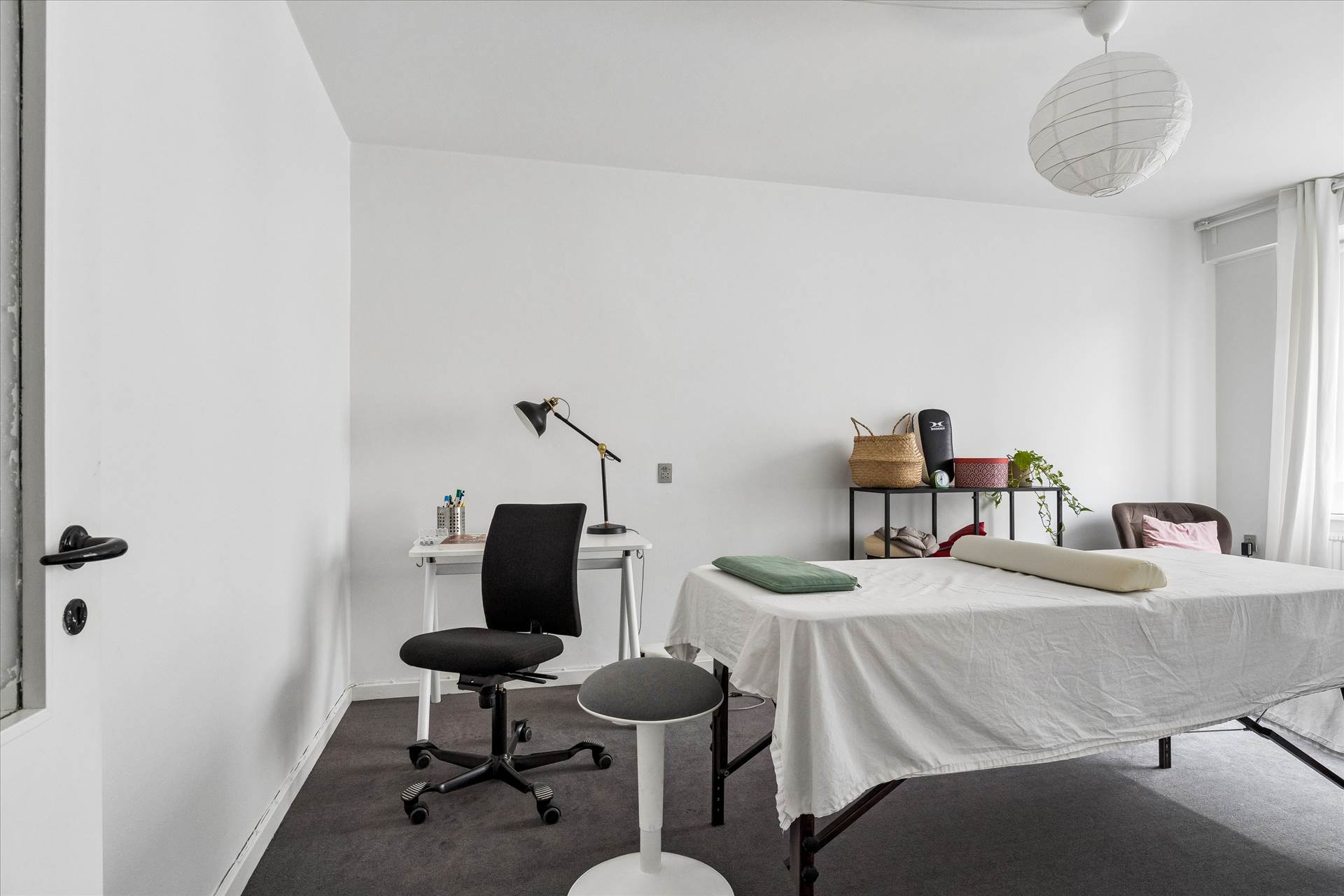 I stueetagen er der store vinduer, der sikrer rigeligt lys og et åbent miljø med flere kontorer/behandlerrum i varierende størrelser, et rummeligt køkken og toilet. Underetagen indeholder et stort lokale samt toilet og mindre depotrum. Direkte udgang til bagsiden af ejendommen med adgang til elevator, der giver nem transport mellem etager. Vinduer giver godt lys også i underetagen.