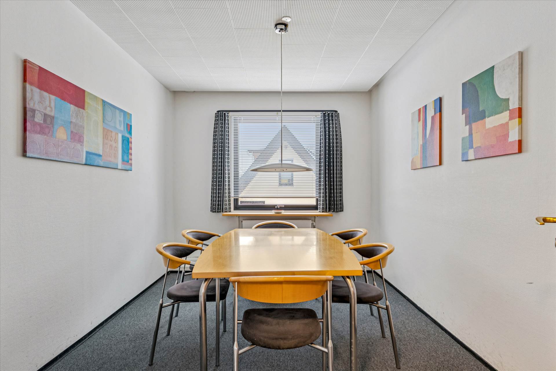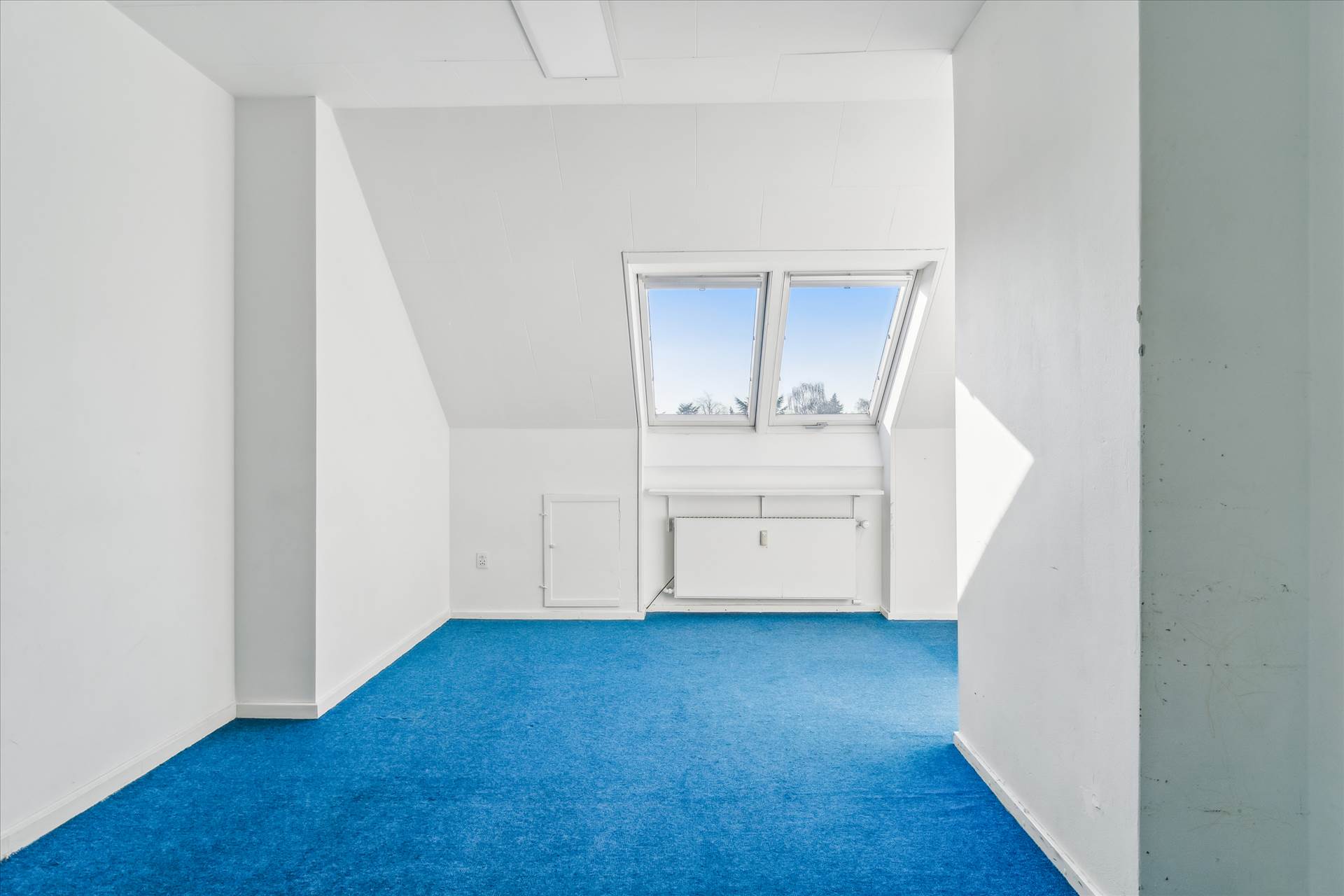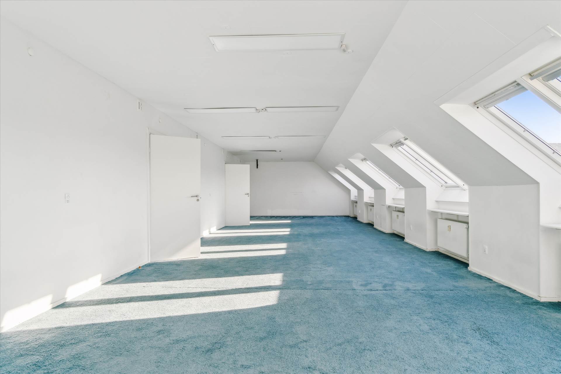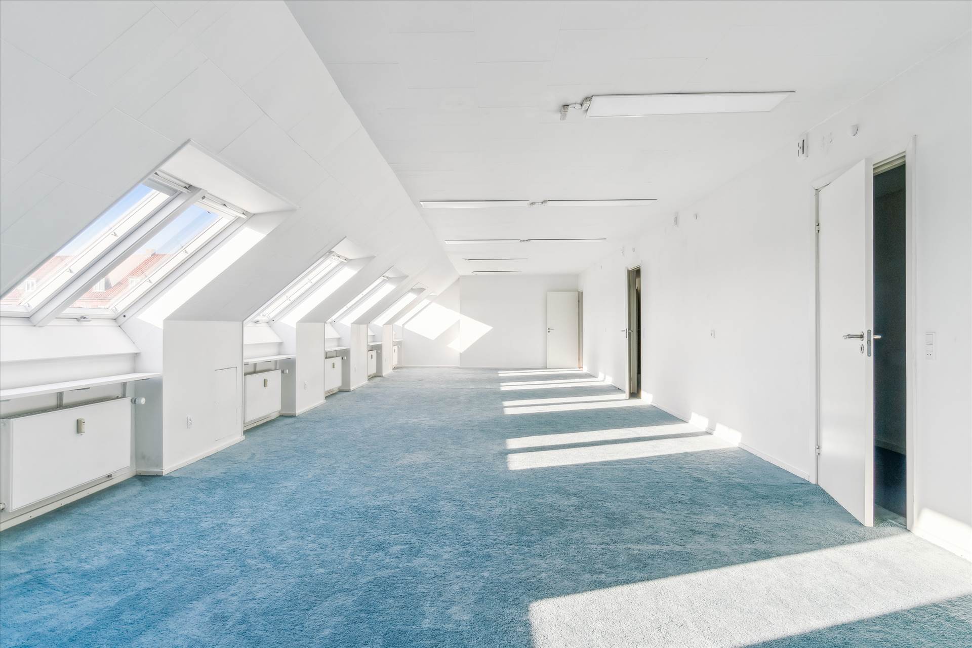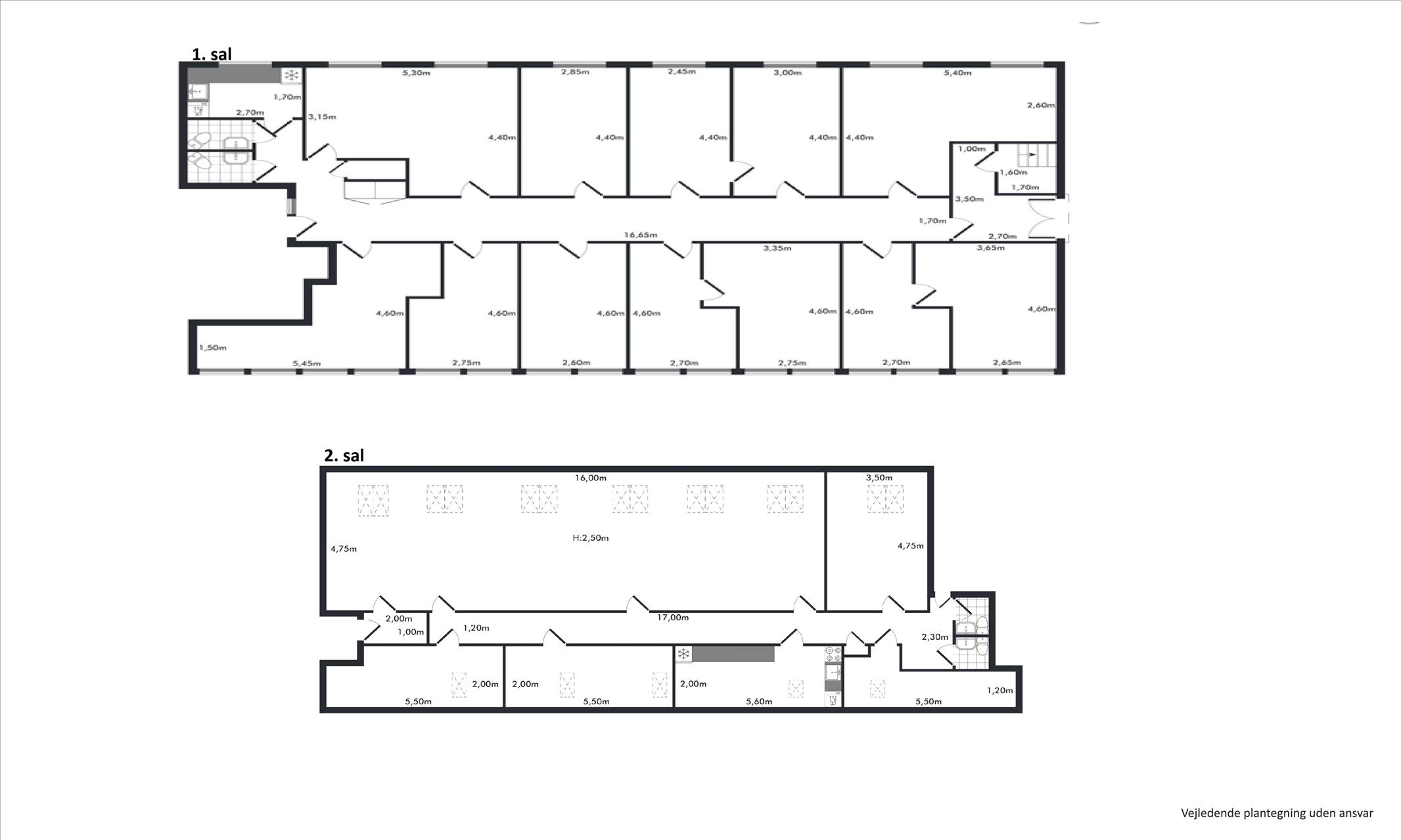 På 2. sal er der fordelingsgang, lyst storrumskontor, yderligere et større kontor/møderum samt 2 mindre møderum, lille lager-/printrum, køkken og to toiletter. Storrumskontoret kan nemt deles op i flere mindre kontorer, hvis der ønskes cellekontorer.