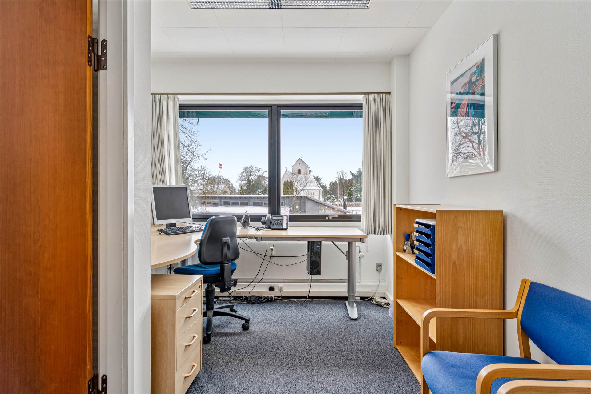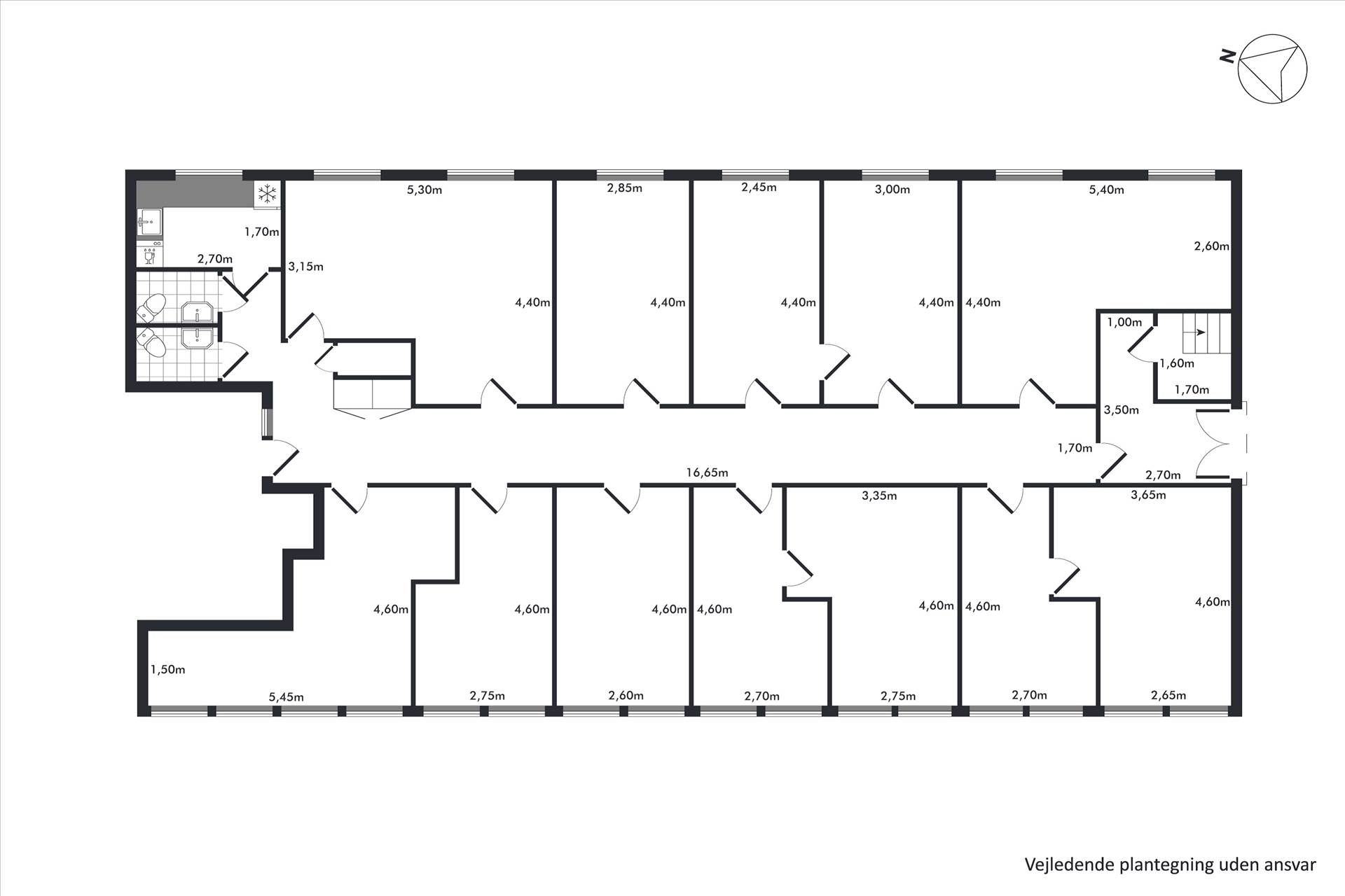 Lejemålet indeholder fordelingsgang, 12 gode kontorer i varierende størrelser (nogle kan sammenlægges), lille lager-/printrum, køkken og to toiletter.