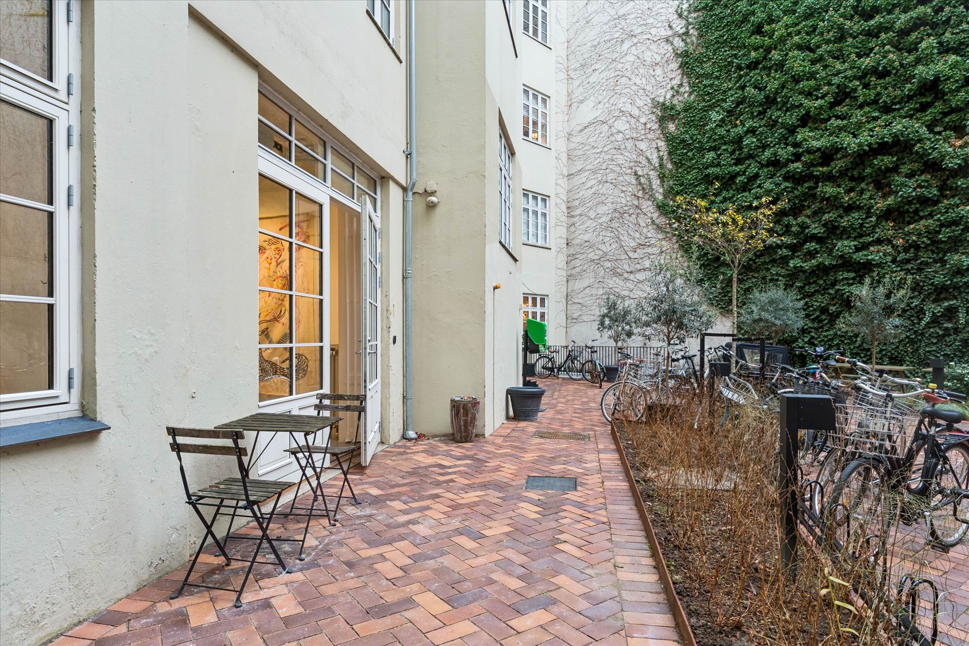 Via gården har lejemålet sin egen lille terrasse foran indgangen, som giver en sjælden mulighed for et privat udendørsareal midt i København. Et oplagt sted til en kaffepause eller frokost.