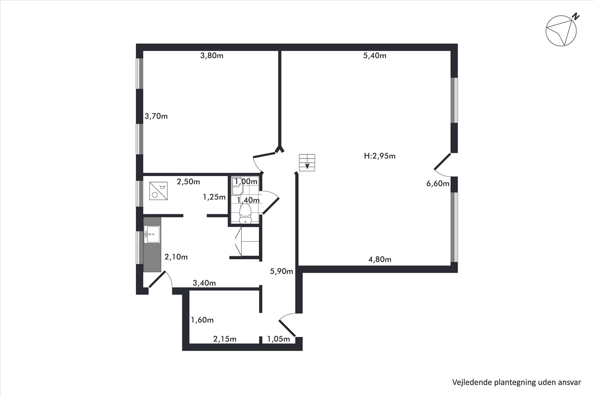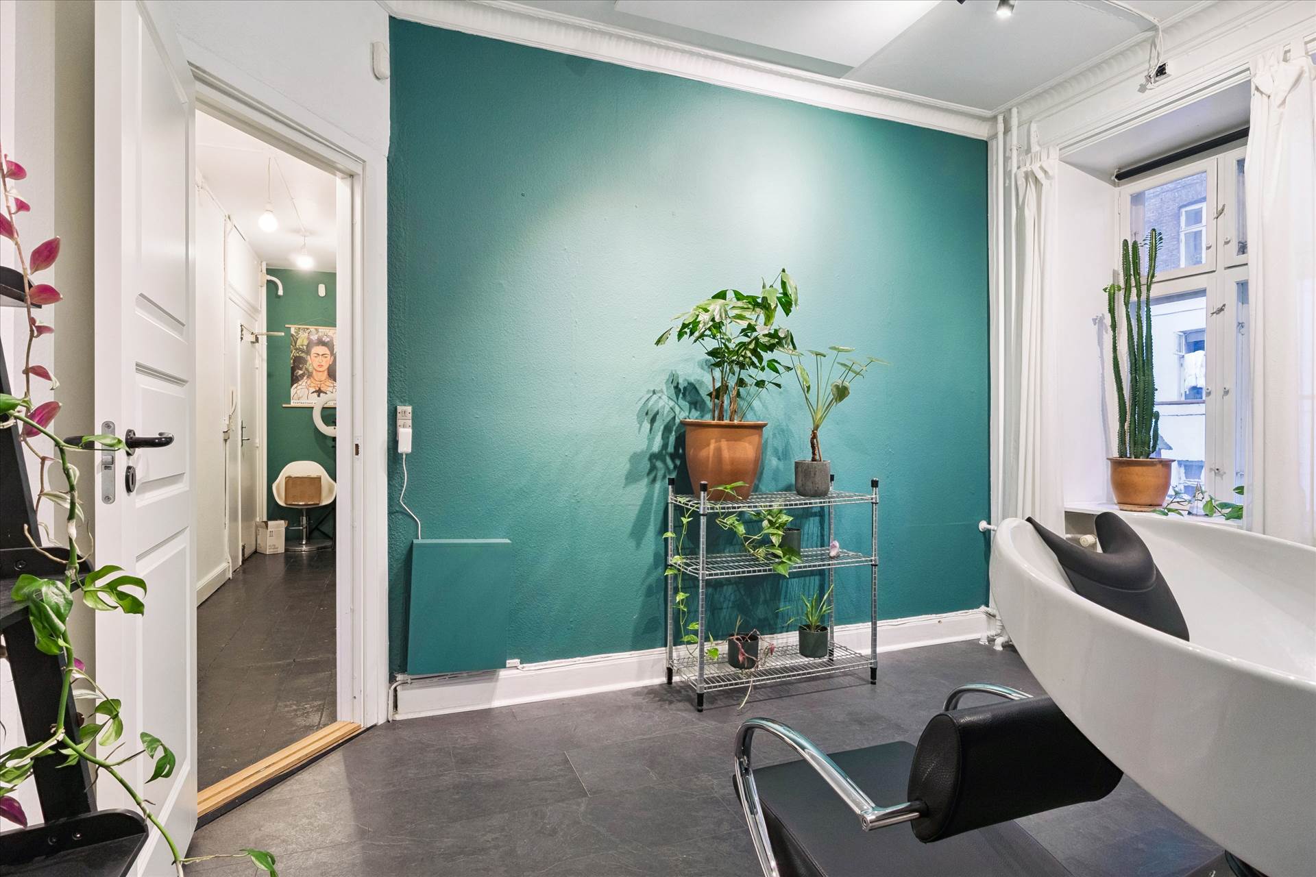 Indretningen rummer et større åbent areal samt flere disponible rum, suppleret af køkkenfaciliteter, toilet og depot. Planløsningen er fleksibel og giver mulighed for indretning efter lejers behov. Lejemålet egner sig til en bred vifte af formål såsom klinik, kontor, showroom, galleri, salon, undervisning eller andet liberalt erhverv.