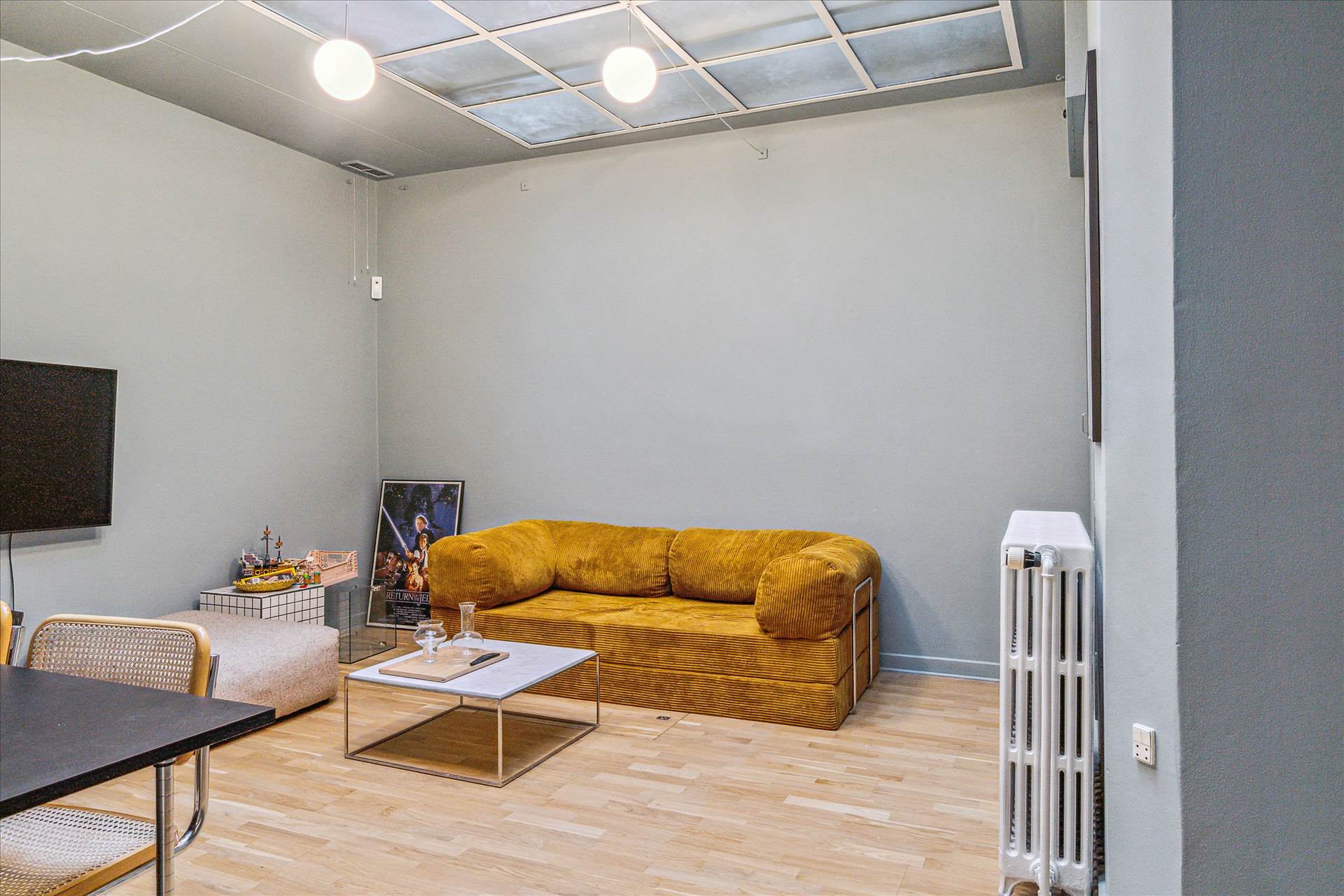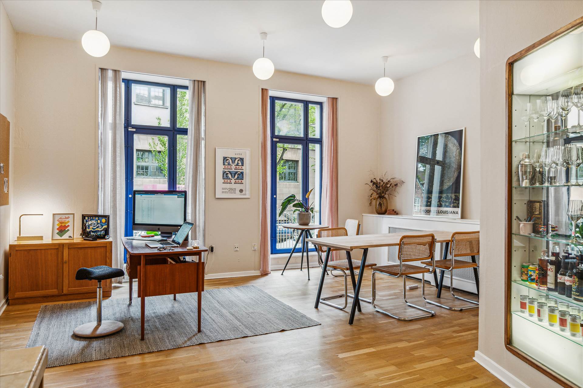 Derudover rummer lejemålet et større møderum med ovenlysvinduer, idet kontoret er beliggende under den charmerende fælles gårdterrasse. Dette giver et behageligt, roligt lys, som er ideel til møder, fordybelse eller behandlerrum. Lejemålet indeholder desuden et pænt køkken samt eget toilet med adgang fra bagtrappen, hvilket sikrer både komfort og funktionalitet i hverdagen.