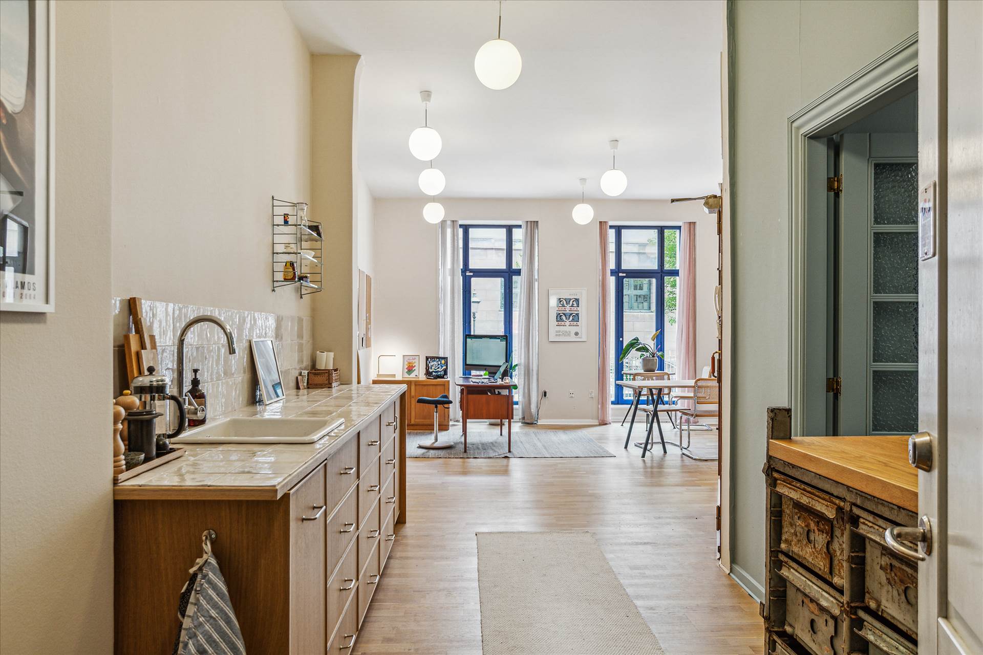 Kontoret fremstår lyst, indbydende og særdeles velindrettet. Lejemålet består af et stort, højloftet kontorrum med to imponerende gulv-til-loft vinduer, som giver et fantastisk lysindfald og en smuk udsigt til Vor Frue Kirke. Rummet skaber en repræsentativ ramme for den daglige arbejdsdag og egner sig både til åbent kontor, showroom eller kreativt arbejdsrum.