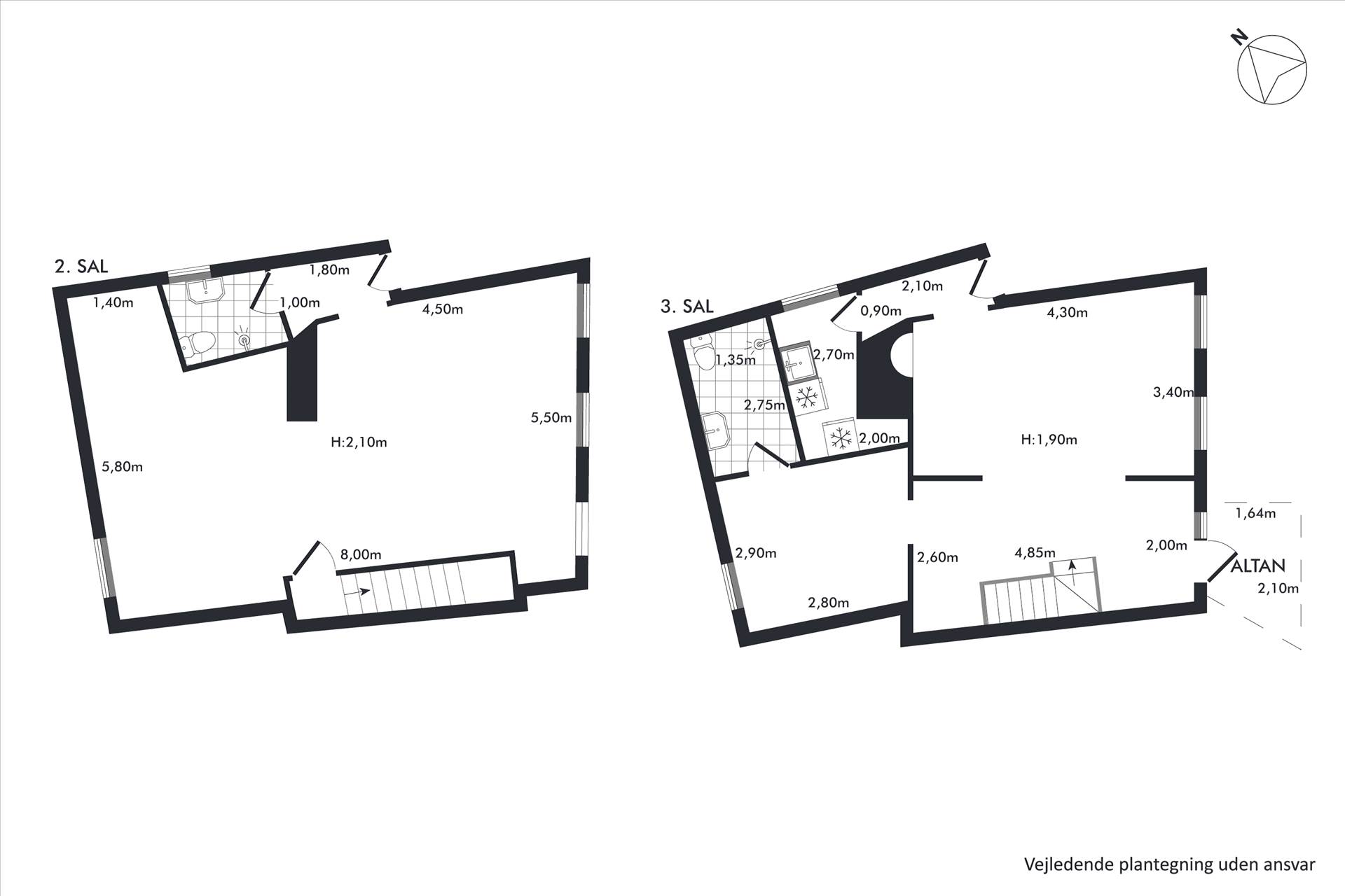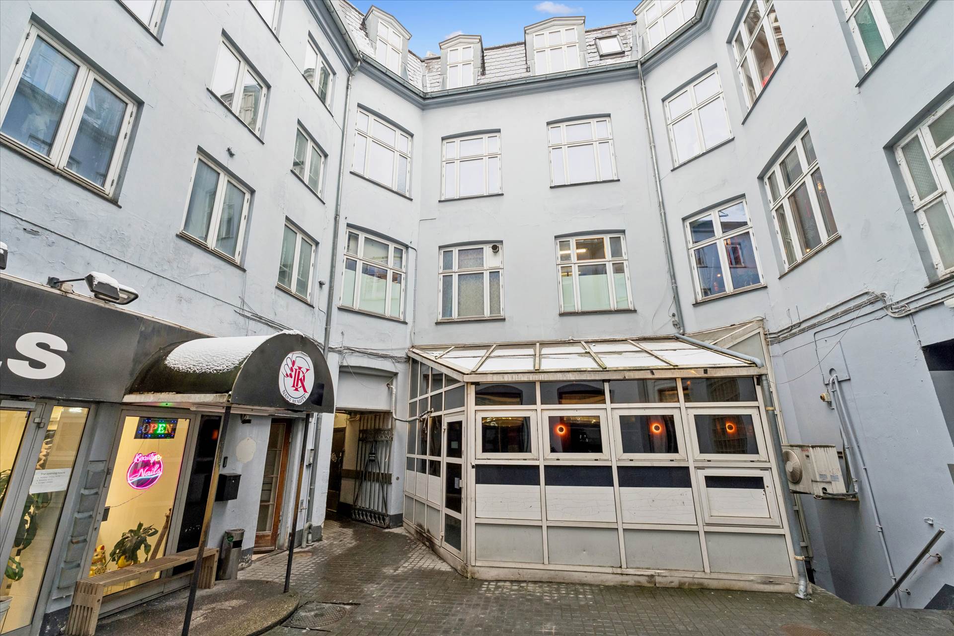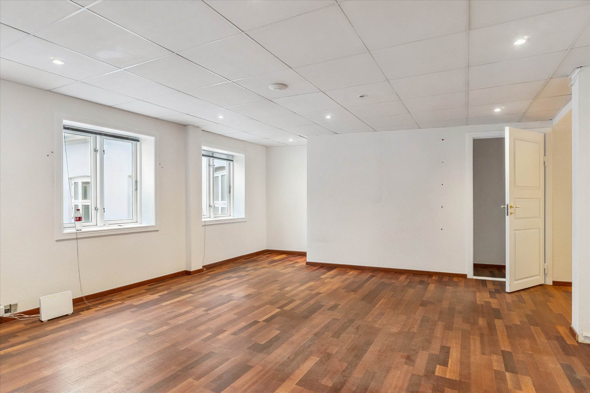 Lejemålet indeholder på 2. sal: entré, toilet og et dejligt stort rum (der nemt kan opdeles). Herfra intern trappe op til 3. sal, hvor der er 2 gode rum én suite, et mindre rum et toilet med brus samt et lille køkken. Udgang til en hyggelig altan fra 3. sal. Lejemålet har smukke hårdtræsgulve i alle kontorer.