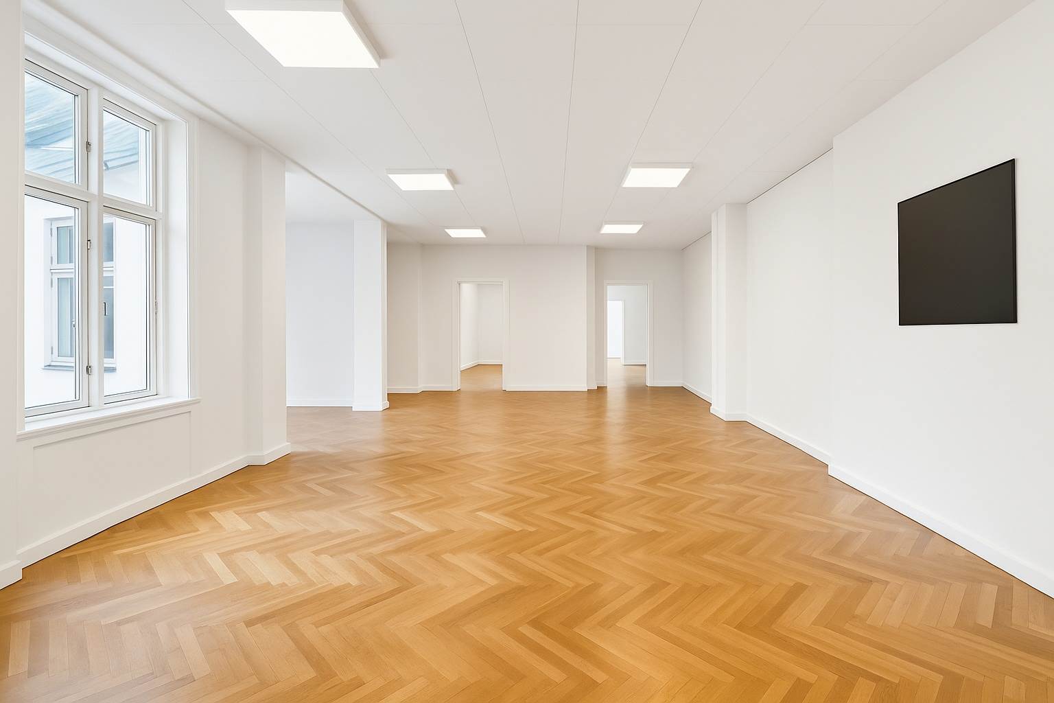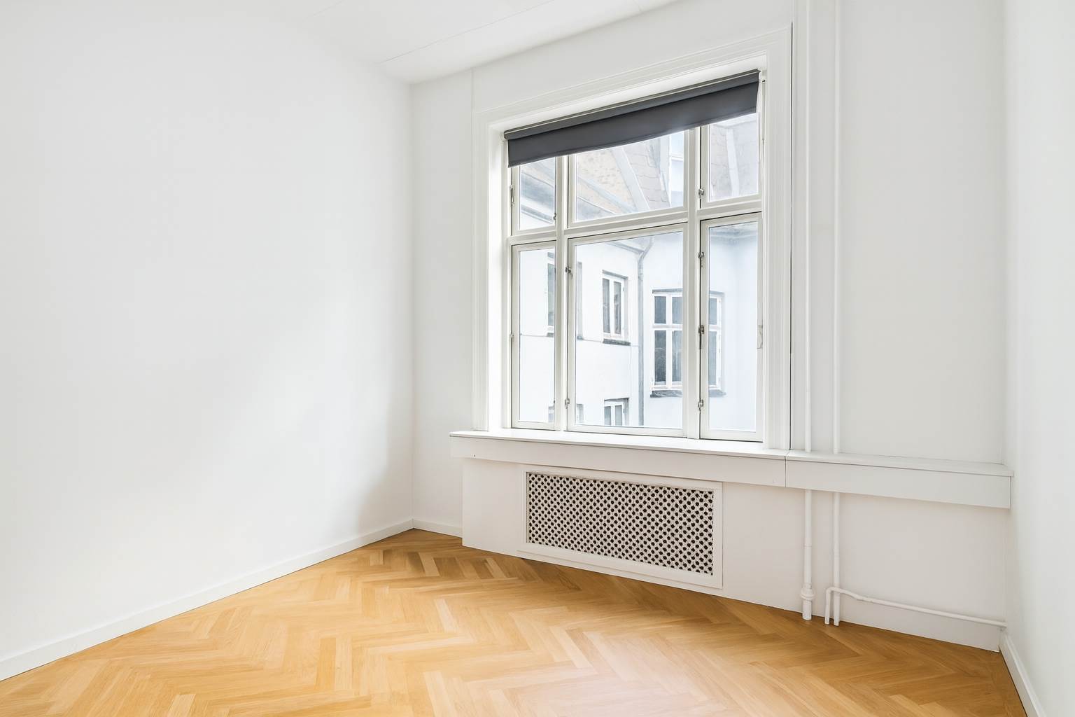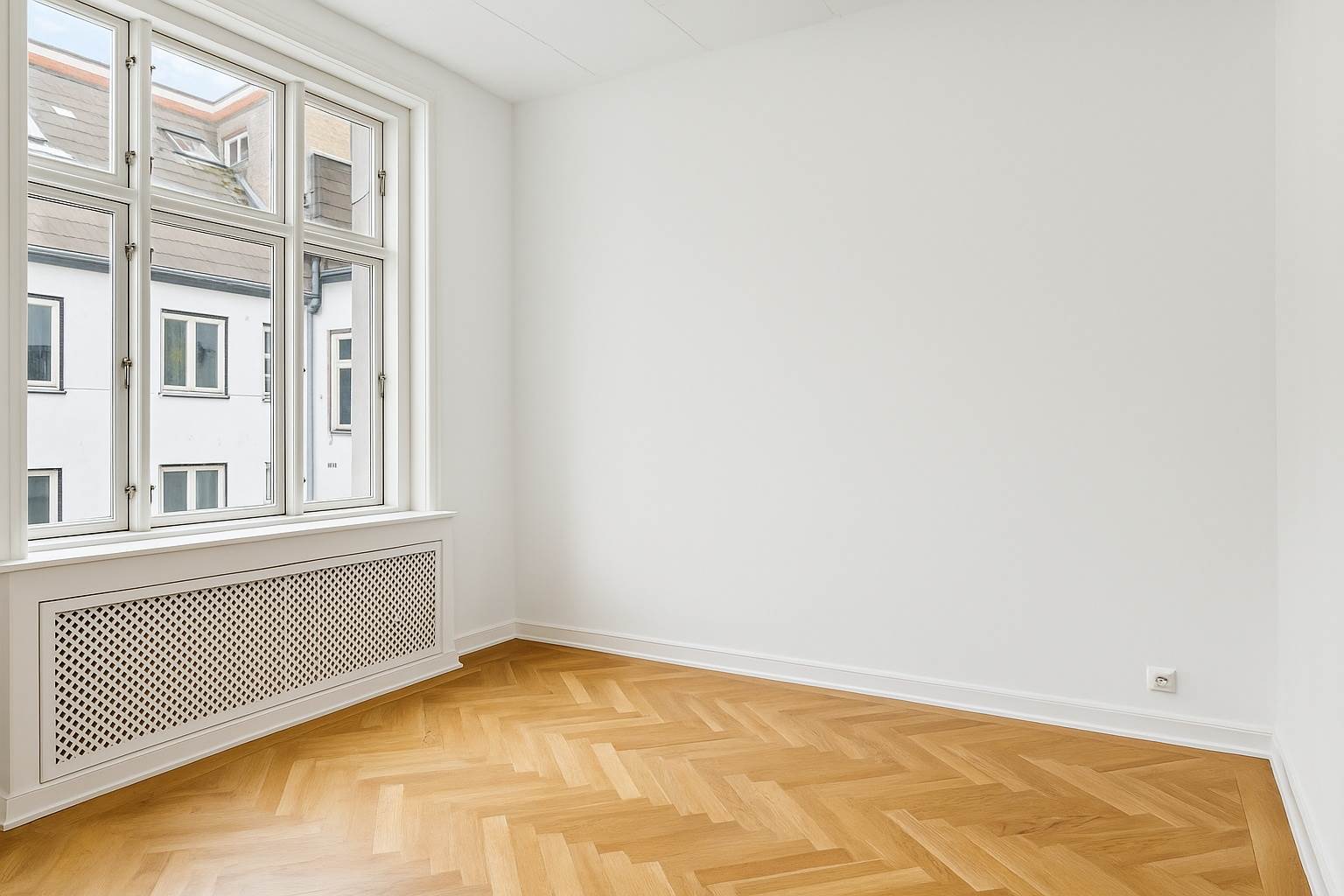 Lejemålet har smukke trægulve i sildeben og store og meget høje vinduespartier, der giver et fantastisk lysindfald.