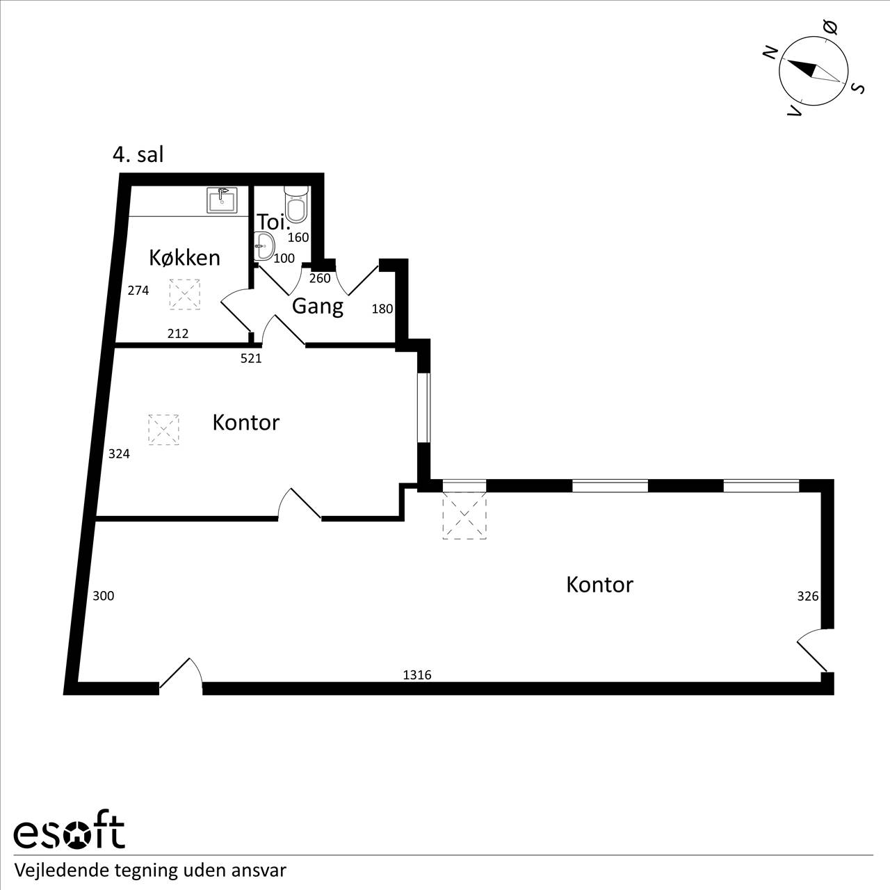 Lejemålet er beliggende på 4. sal i pæn ejendom og indeholder lyst storrumskontor, lille kontor mødelokale, lille køkken samt et toilet.