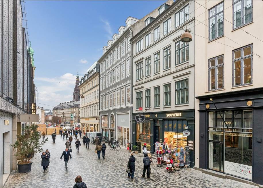 Området er præget af de mange forretninger, caféer og spisesteder – her er alle muligheder lige foran hoveddøren. Endvidere kun 200 meter til metro på Gammel Strand og 400 meter til Kongens Nytorv Metro.