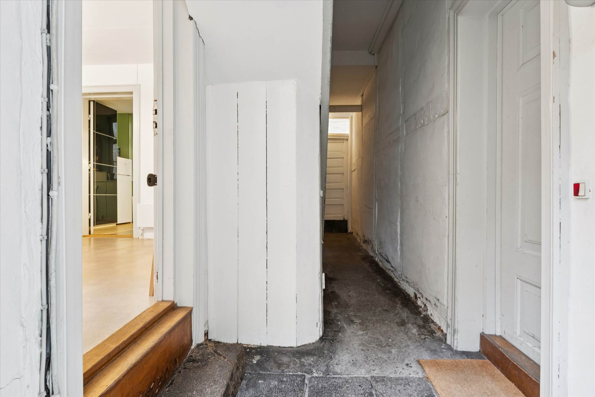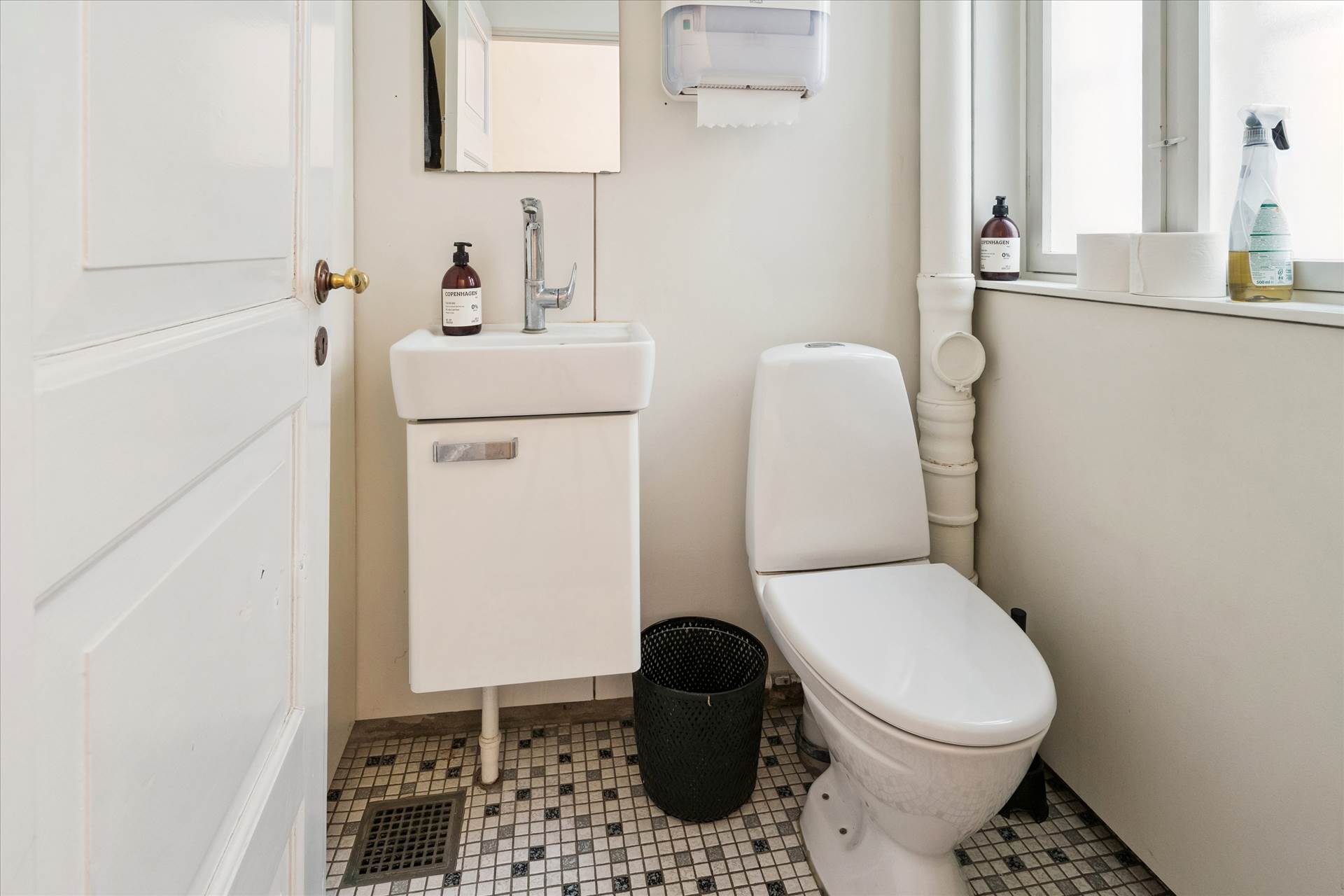 På venstre side er et mindre lokale, der i dag anvendes som mødelokale, med tilstødende tekøkken. Fra gangen er der adgang til et toilet, som udelukkende hører til lejemålet.