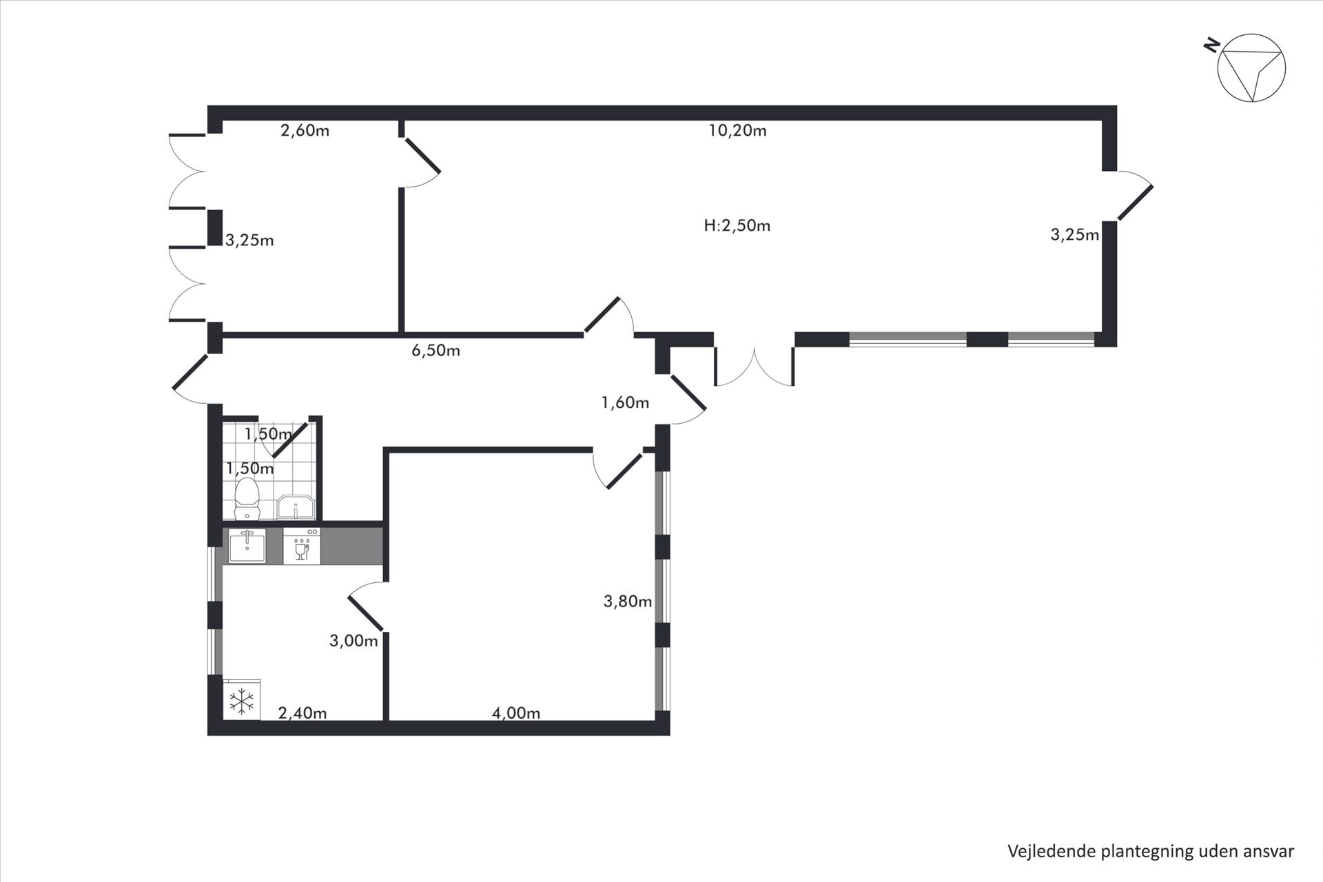 Lejemålet har to separate indgange. Den ene giver direkte adgang til det store kontorrum, mens der alternativt er adgang via bagtrappen, hvor lokalerne er placeret på hver sin side af opgangen. Til højre findes et rummeligt lokale med tilhørende baglokale.