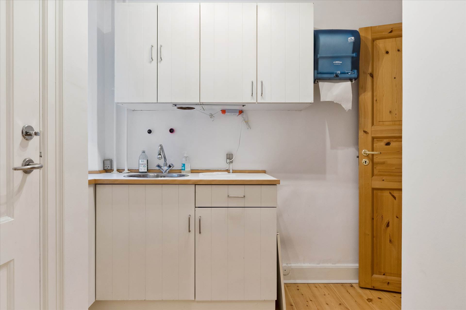 Lejemålet består af to selvstændige rum, der begge har gode vinduer og et behageligt lysindfald – det ene vender mod gaden, og det andet mod gården. Denne opdeling gør det nemt at indrette med både arbejdsområder og mødelokale eller at skabe separate funktioner, alt efter behov. Derudover findes et separat køkken med god plads til frokostpauser eller lettere madlavning samt et nydeligt toilet.