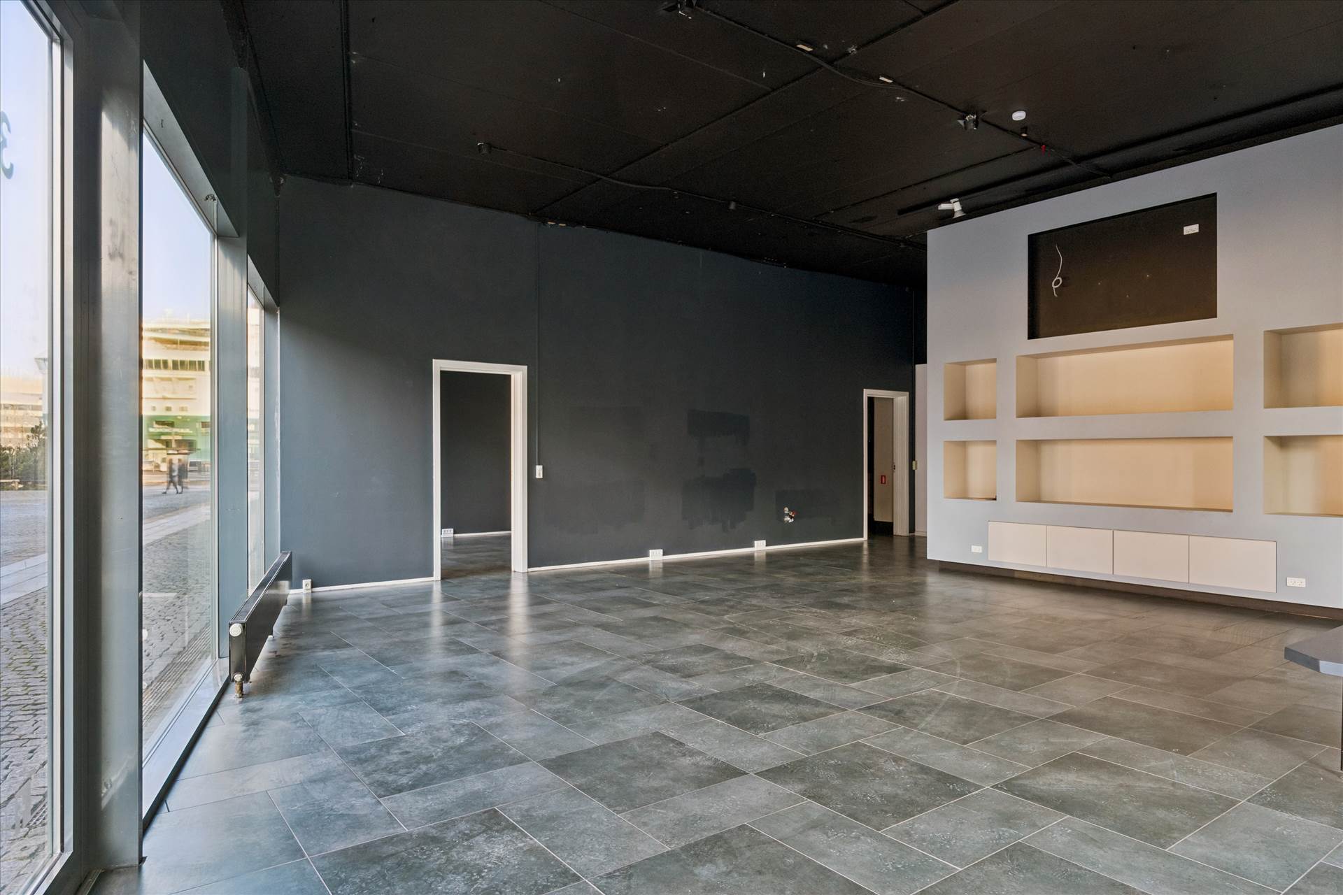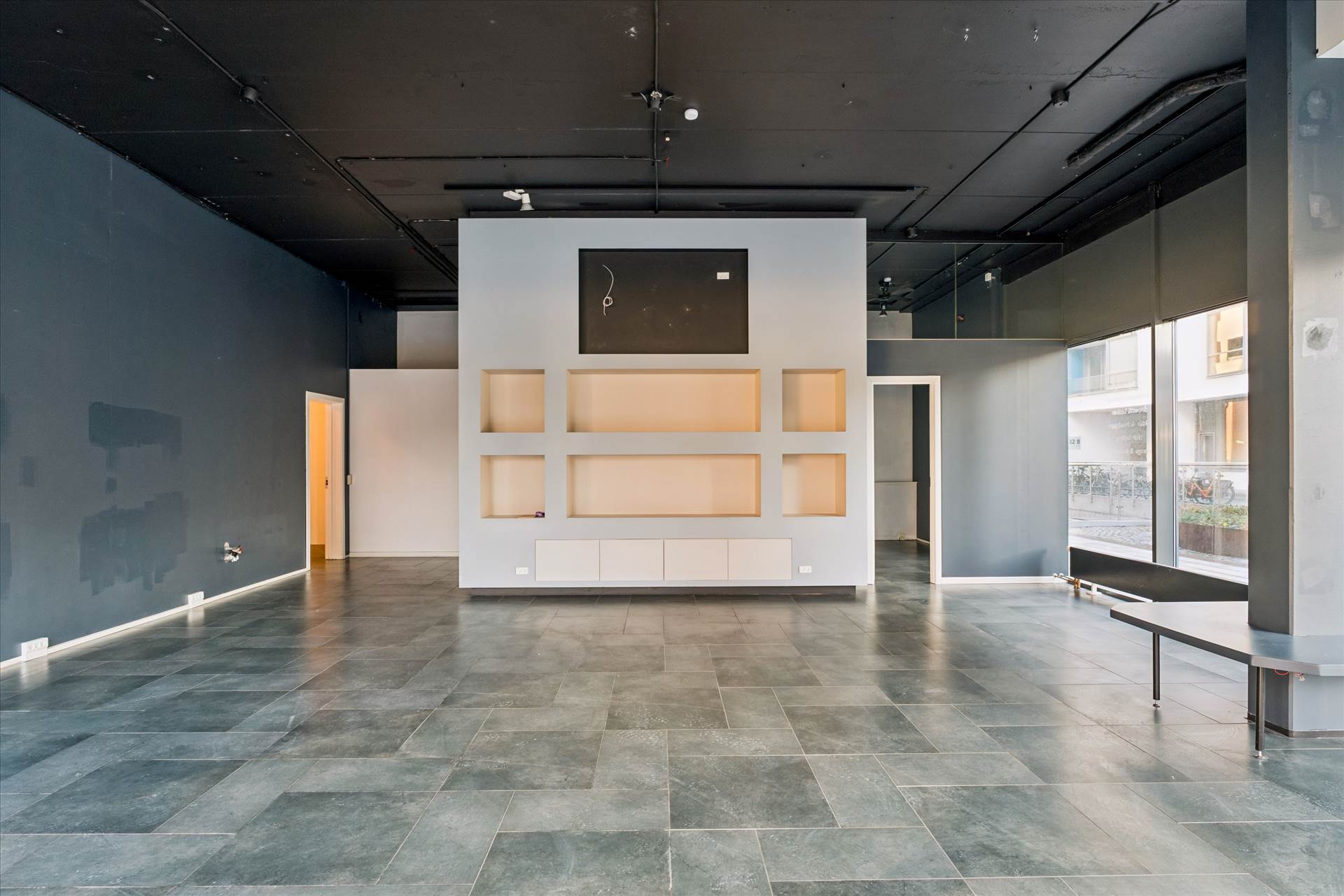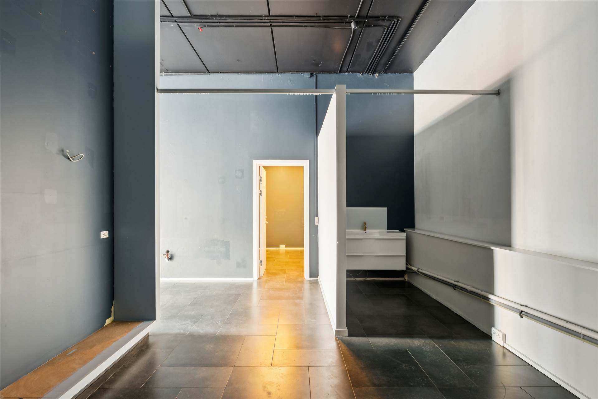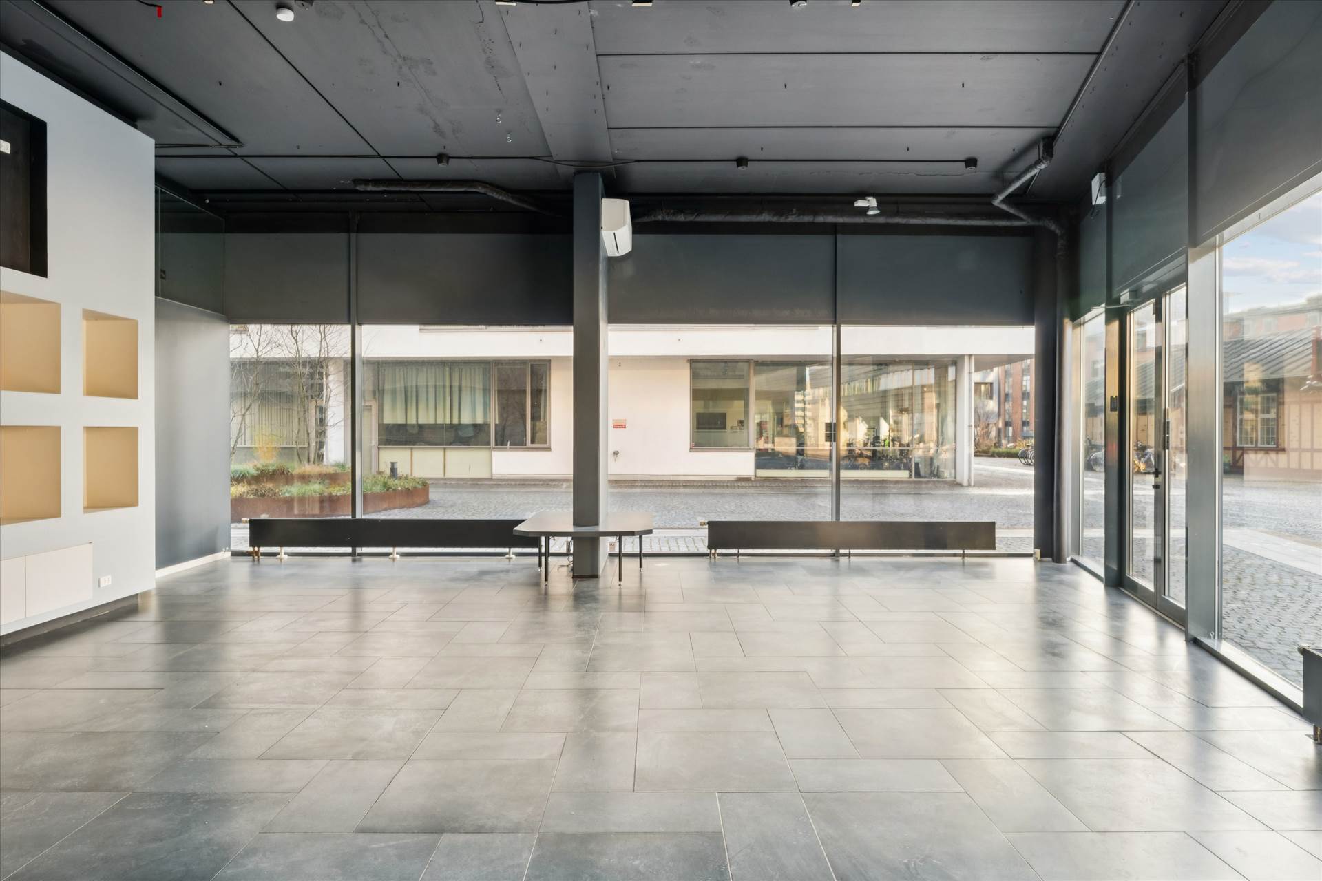Indvendigt fremstår lejemålet lyst og rummeligt med højt til loftet overalt, hvilket giver en luftig og eksklusiv fornemmelse. Det store, regulære butikslokale på hjørnet udgør hjertet i lejemålet og kan nemt indrettes fleksibelt efter behov. Herudover er der etableret ekstra baglokaler, et mindre tilstødende lokale, et praktisk baglokale med thekøkken samt toilet. Den flotte klinkebelægning på gulvet bidrager til et moderne og indbydende udtryk, der passer perfekt til både showroom, galleri, livsstilsbutik eller anden specialforretning. Lejemålet må ikke anvendes til madproduktion eller servering.
