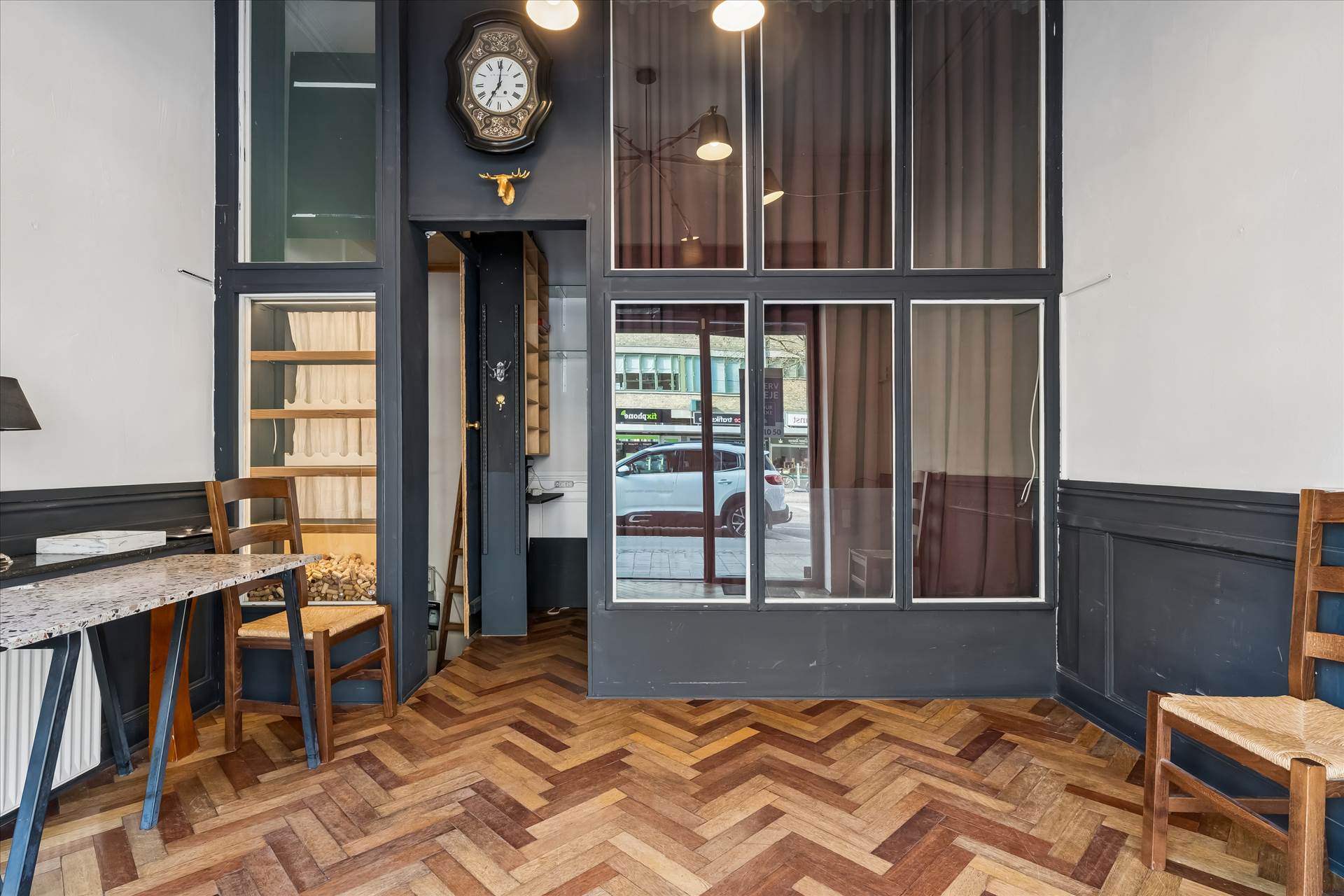 Stueetagen fremstår med smukt sildebensparket og høje paneler, som giver lokalet et elegant og præsentabelt udtryk. Den høje loftshøjde gør det oplagt at arbejde med indretning, display eller udstilling.