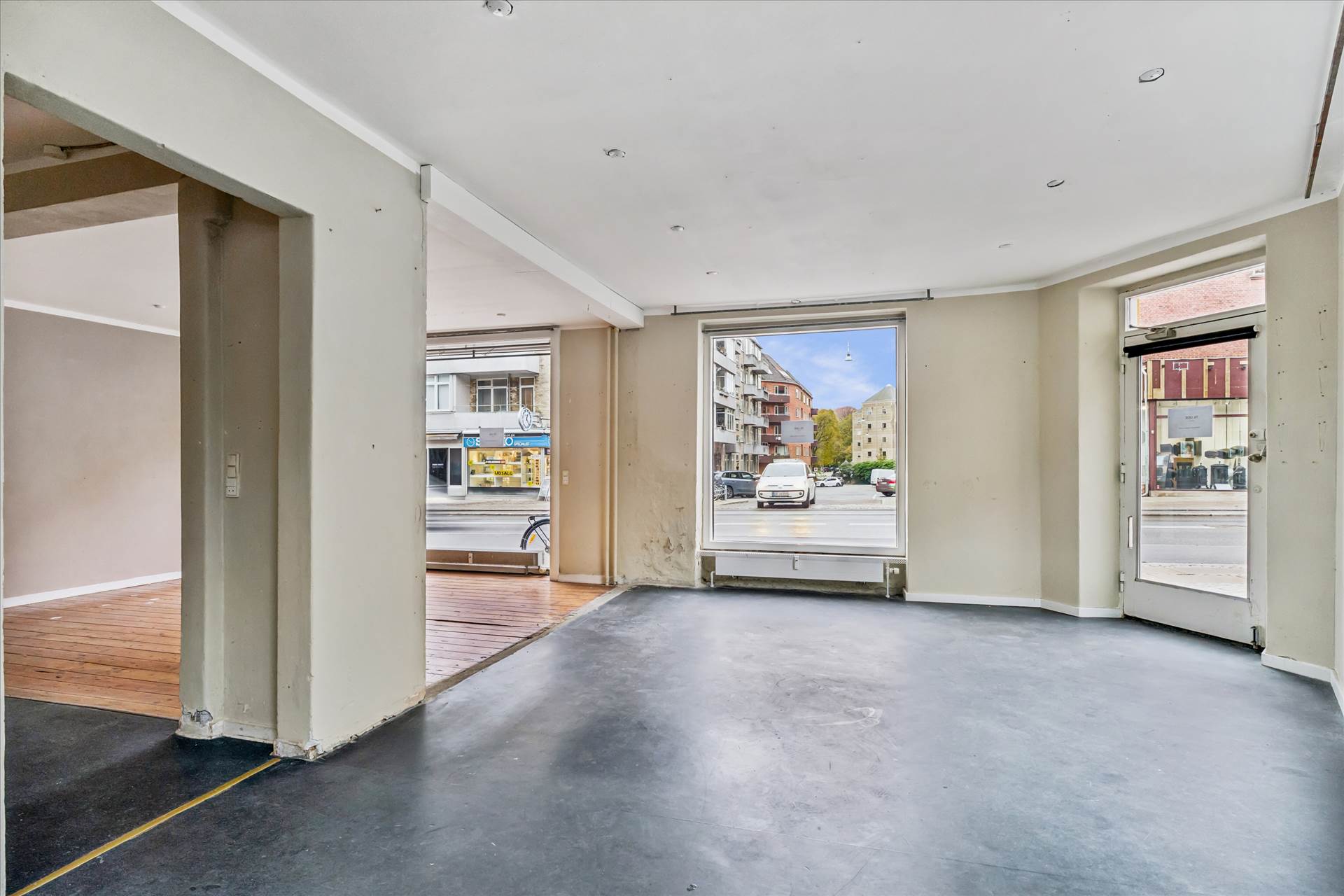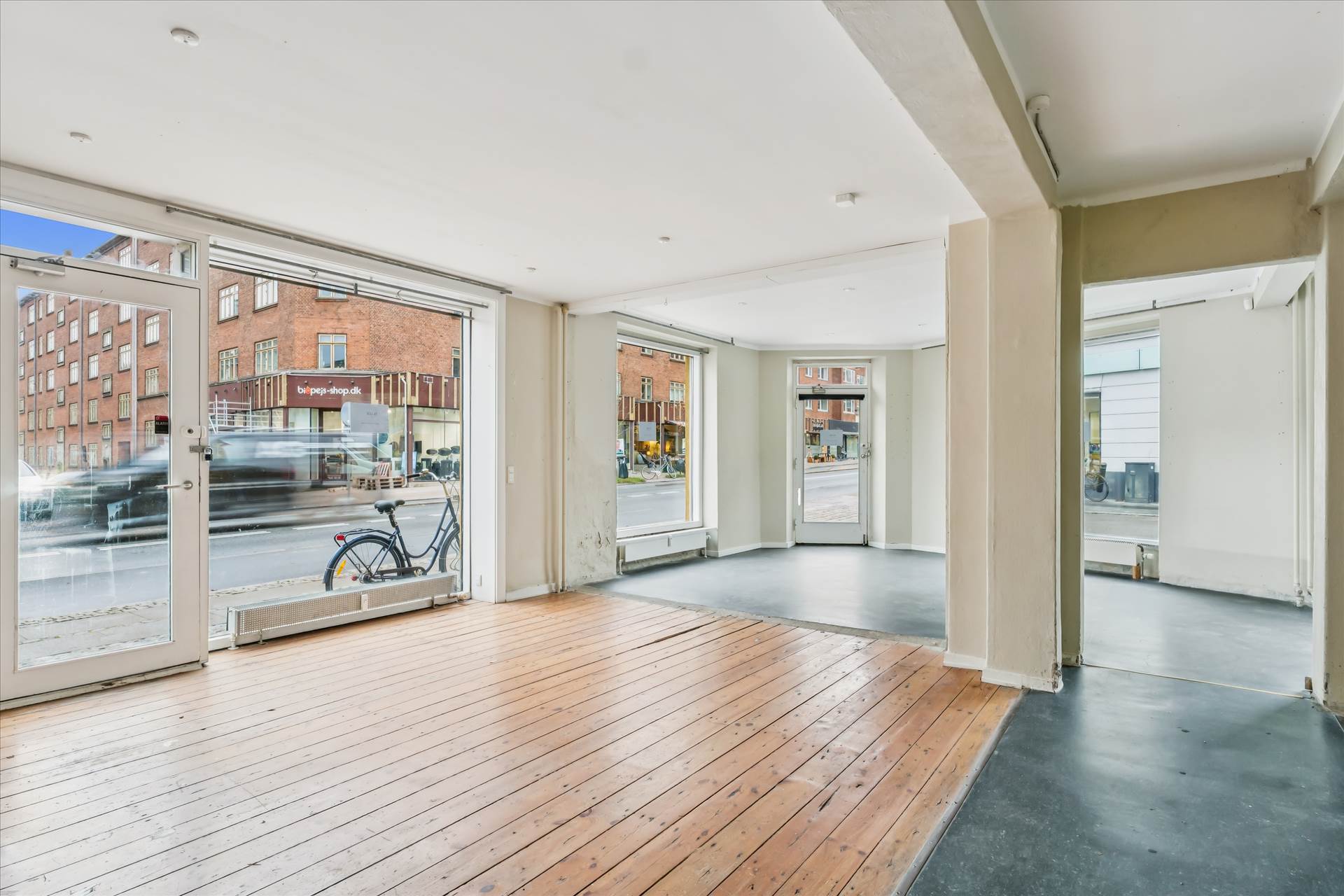 Butikken består af et stort, lyst og indbydende vinkellokale, der strækker sig langs begge gader. Med hele syv facadevinduer og to indgangsdøre får lejemålet et enestående lysindfald og en præsentabel fremtoning, som giver optimale muligheder for udstilling og markedsføring. De brede vinduespartier skaber en åben og indbydende atmosfære, der naturligt tiltrækker opmærksomhed fra de mange forbipasserende.