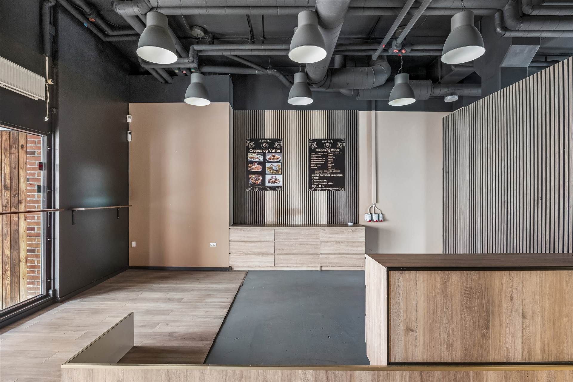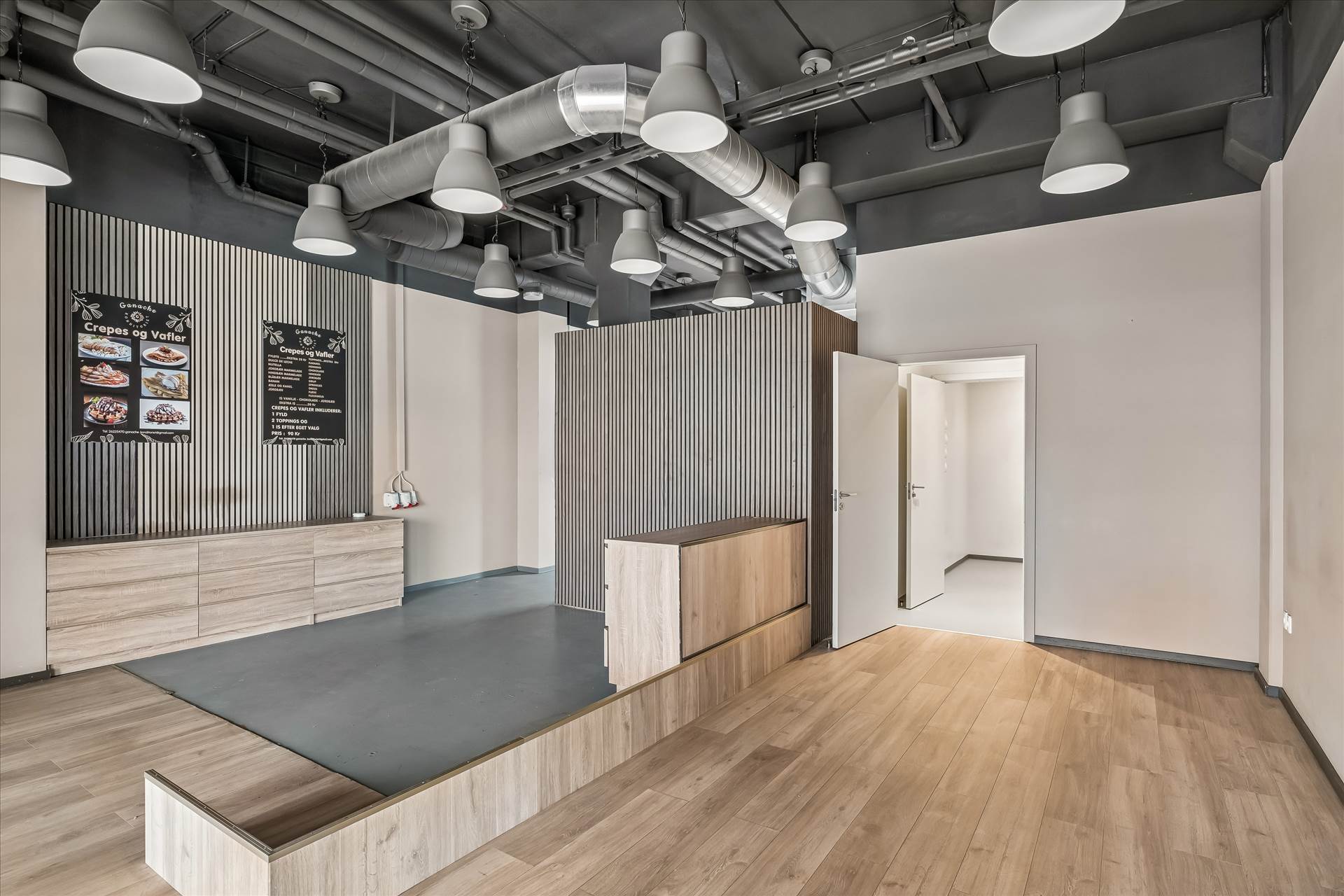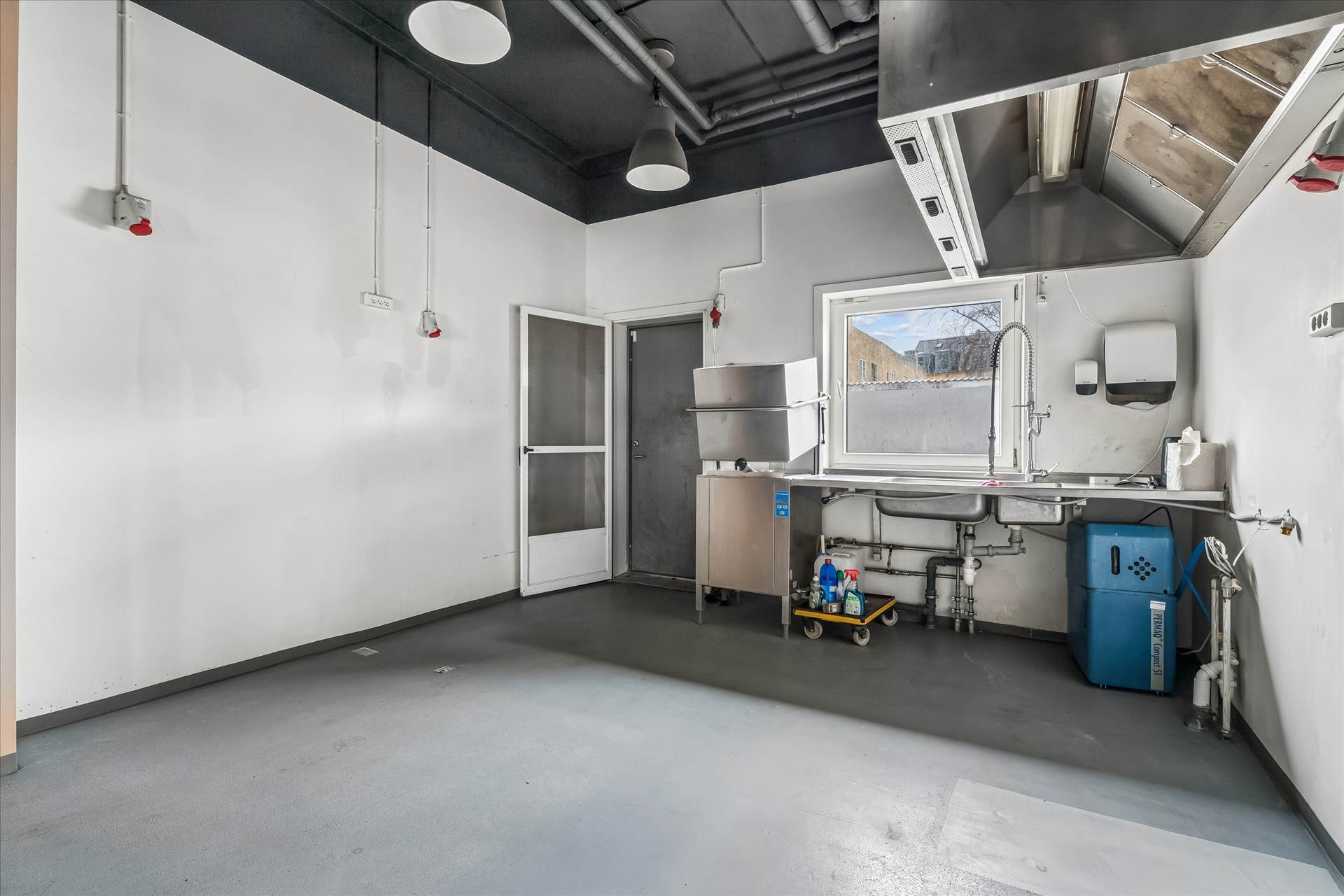 Fuldt funktionelt produktionskøkken med udsugning og installationer. Indbydende kundeområde med stor facade og godt lysindfald. Loftshøjde på ca. 3,8 meter giver rummelig og moderne atmosfære. Toilet og baglokaler.