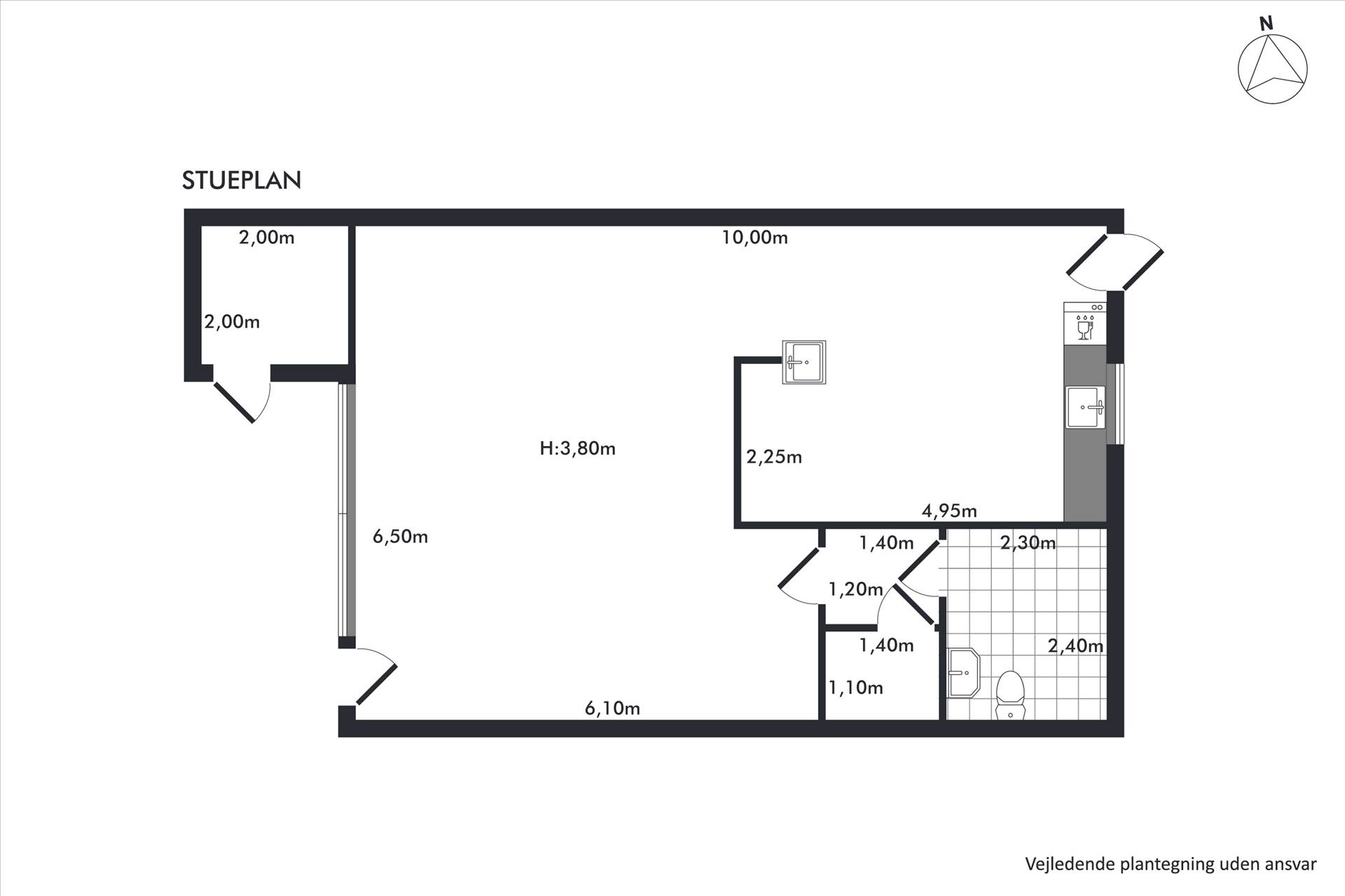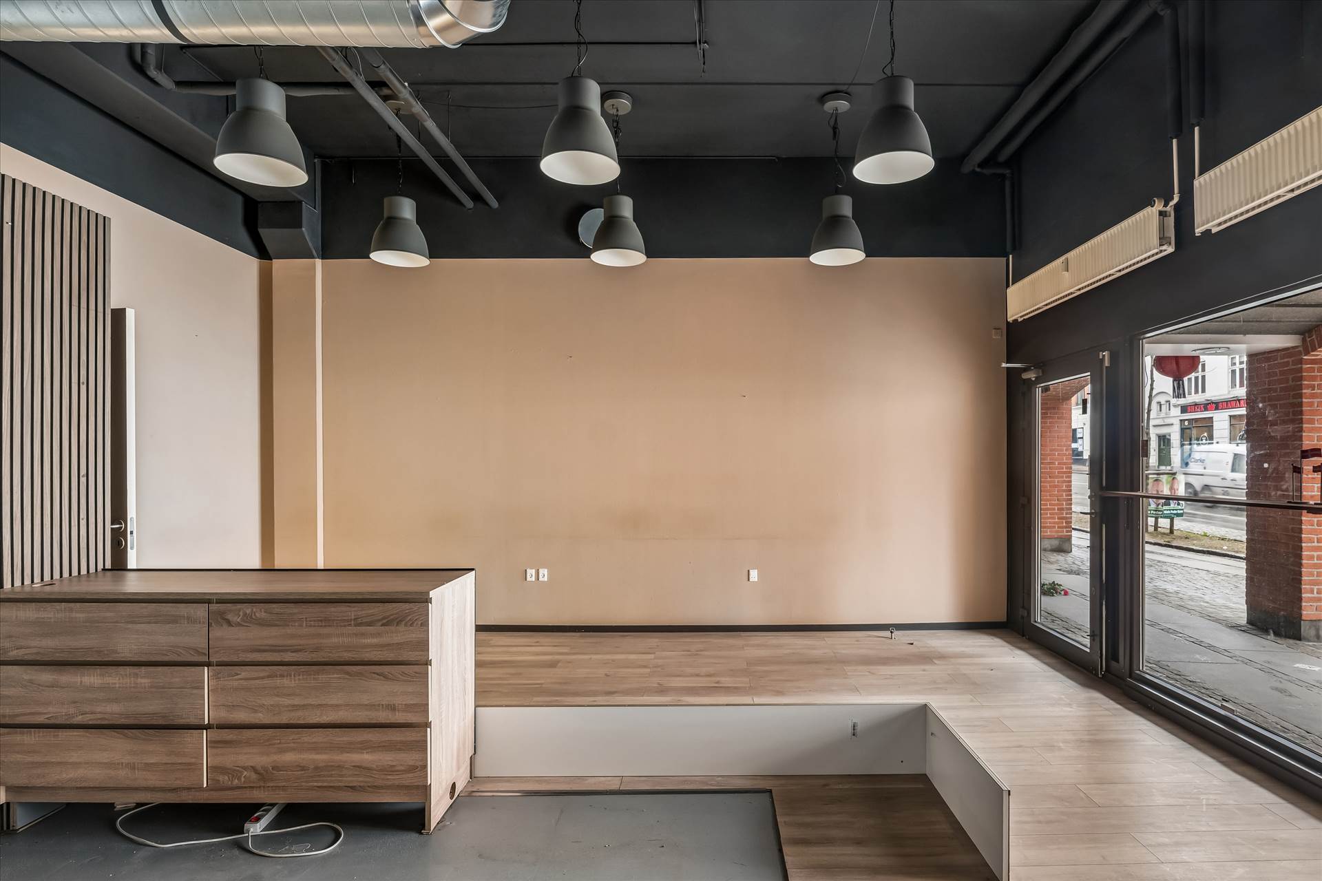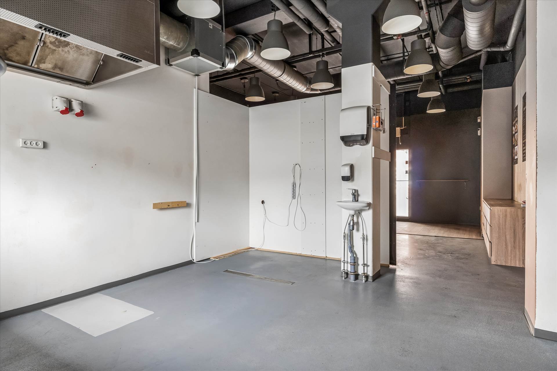 Fuldt funktionelt produktionskøkken med udsugning og installationer. Indbydende kundeområde med stor facade og godt lysindfald. Loftshøjde på ca. 3,8 meter giver rummelig og moderne atmosfære. Toilet og baglokaler.