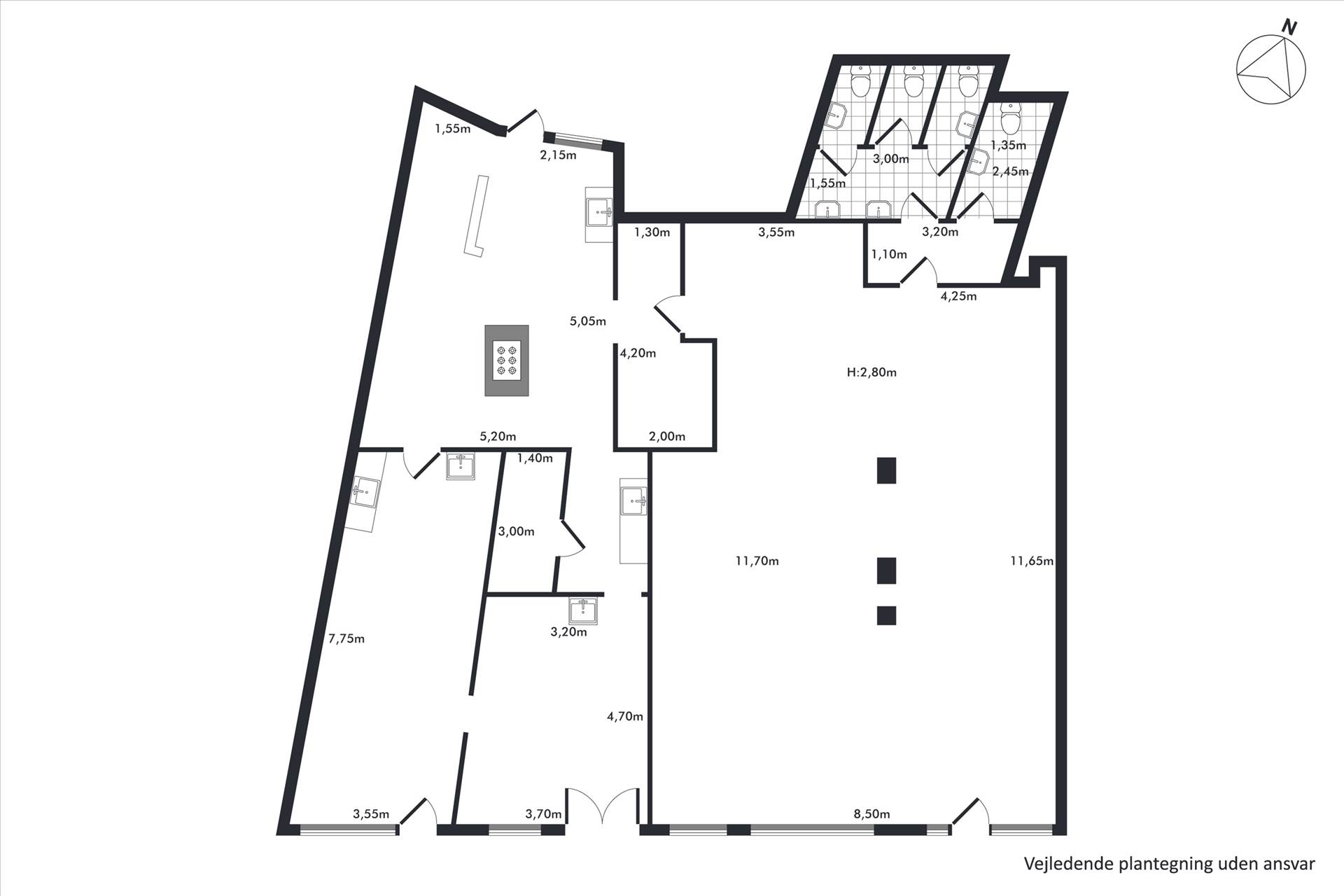 Lokalet rummer et stort og veludstyret køkken, ideelt til professionel drift, samt en rummelig lagerkælder med gode faciliteter til personalefunktioner og opbevaring.